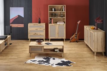 - Trwałość i łatwość pielęgnacji: Meble z kolekcji BORNEO, wykonane z wysokiej jakości płyt laminowanych w dekorze dąb artisan oraz elementów z plecionką, są odporne na zarysowania, wilgoć i łatwe do utrzymania w czystości. To gwarantuje ich długotrwałe piękno i funkcjonalność.