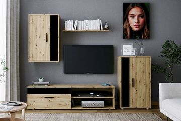 BENSON zestaw, kolor: dąb artisan - czarny Przedstawiamy zestaw mebli BENSON, idealny do każdego nowoczesnego salonu. Wykonany z wysokiej jakości płyty meblowej o grubości 16 mm, łączy trwałość z estetyką. Jego kolor dąb artisan w połączeniu z czarnymi akcentami tworzy harmonijną i elegancką kompozycję, która będzie doskonałym tłem dla wszelkich dekoracji i sprzętów. W skład zestawu wchodzą: Przestronna komoda z praktycznymi szufladami i otwartą półką Nowoczesna szafka RTV, która pomieści wszystkie niezbędne urządzenia Wisząca półka, idealna na książki lub dekoracje Stylowe uchwyty plastikowe oraz zawiasy Hettich, gwarantujące łatwość użytkowania Zestaw mebli BENSON składa się: szafka RTV - 1szt komoda stojąca 1 szt szafka wisząca - 1szt półka wisząca - 1 szt Zestaw mebli BENSON doskonale sprawdzi się w każdym wnętrzu, nadając mu nowoczesny i elegancki charakter. Dzięki uniwersalnej kolorystyce łatwo dopasujesz go do istniejącego wystroju. Meble są także niezwykle funkcjonalne – oferują mnóstwo miejsca do przechowywania oraz uwydatnią Twój styl. Wszystkie meble w zestawie są zapakowane z myślą o samodzielnym montażu, a w przesyłce znajdziesz szczegółową instrukcję, dzięki czemu złożenie mebli będzie proste i przyjemne. Dodatkowo, produkt objęty jest gwarancją producenta na 24 miesiące. zestaw mebli, materiał: płyta meblowa 16 mm, uchwyty plastikowe, zawiasy Hettich, kolor: dąb artisan / czarny