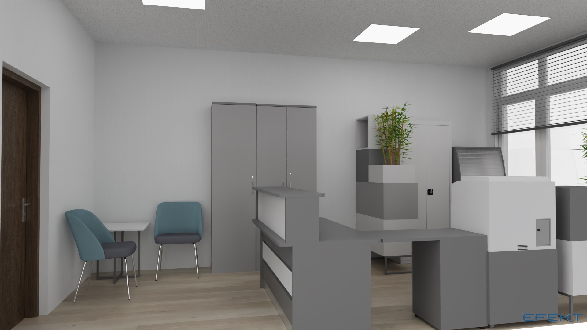 Wnętrze sekretariatu prezentuje się nowocześnie i funkcjonalnie. Dominują stonowane kolory: biel ścian i szarość mebli, co tworzy spokojną i profesjonalną atmosferę.