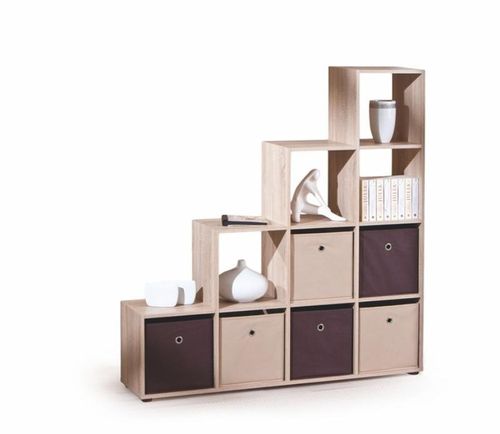 Regał wyposażony jest w kolorowe pojemniki, które dostępne w odcieniach beżowym i brązowym, pozwalają na efektywne przechowywanie mniejszych przedmiotów oraz zachowanie porządku. Możesz je łatwo wymieniać oraz dostosowywać do własnych potrzeb. LUINI będzie nie tylko estetycznym, ale i praktycznym dodatkiem do Twojego salonu, biura czy sypialni.
