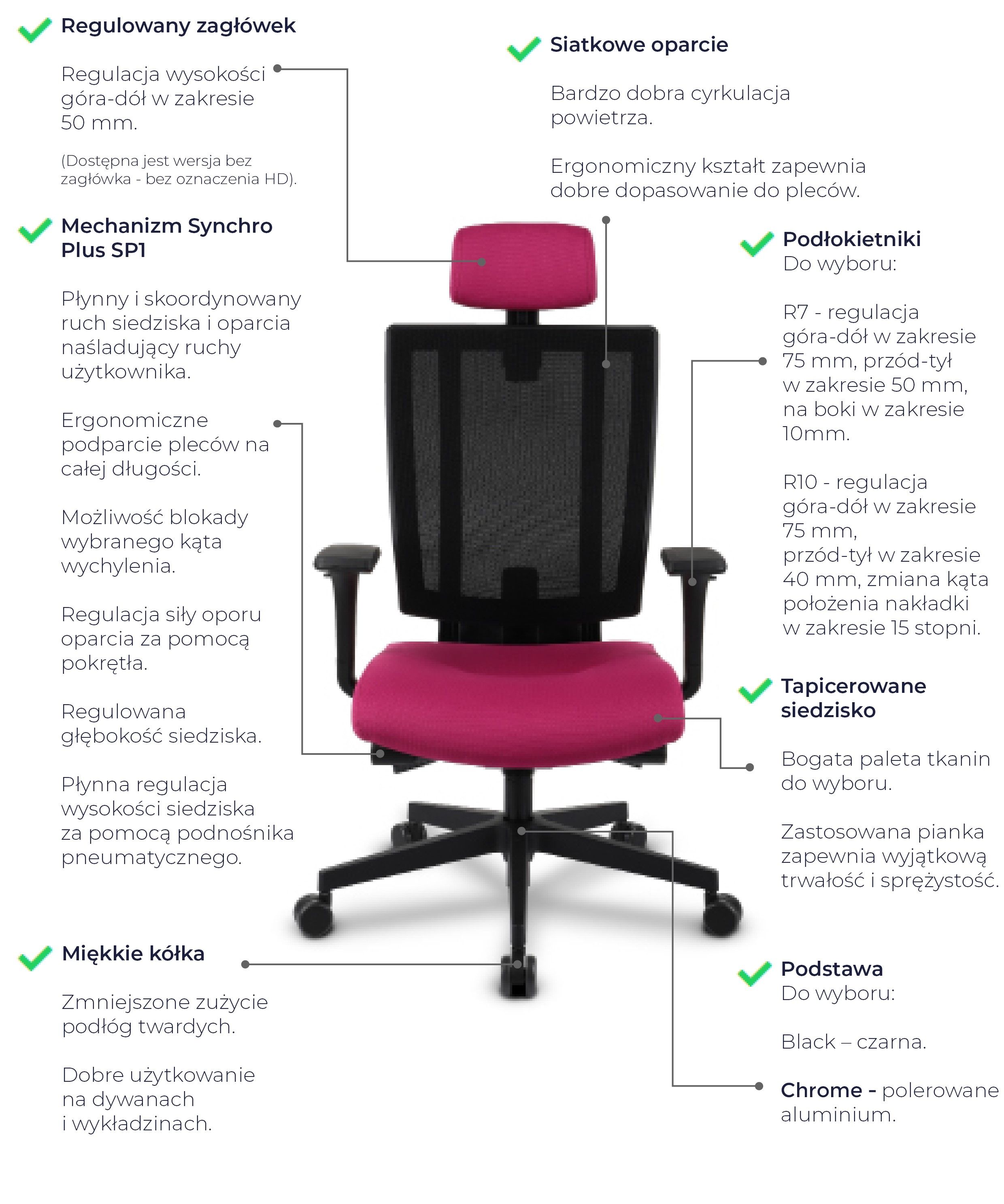 Wyposażony jest w mechanizm ruchowy Synchro Plus. Po zwolonieniu blokady wybranej pozycji, oparcie wychyla się w ruchu skoordynowanym z siedziskiem naśladując ruch Użytkownika w fotelu, gwarantując mu podparcie pleców w każdej pozycji.