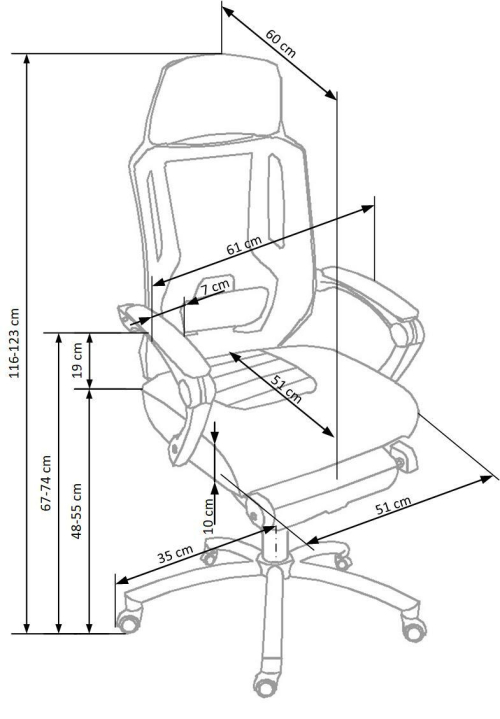 • Wysoka regulacja: Mechanizm TILT umożliwia dostosowanie wysokości siedziska w zakresie 45-53 cm, a sam fotel można podnieść do maksymalnej wysokości 118 cm.