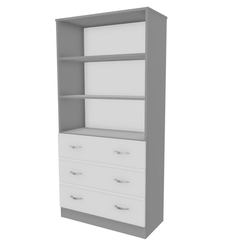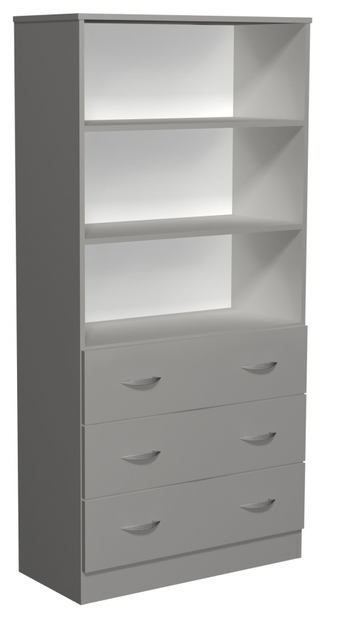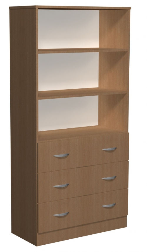 Regał z szufladami Kujawiak 17 wykonany z płyty laminowanej 18mm. W dolnej części 3 szuflady, w górnej 3 przestrzenie na dokumenty.