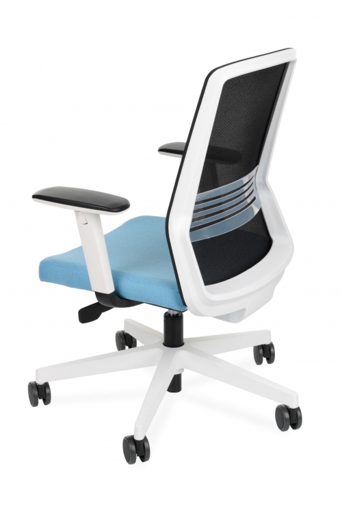 W standardzie krzesło posiada regulowane podłokietniki R6 białe zapewniające prawidłowe ułożenie przedramienia i rąk do pracy przy biurku.