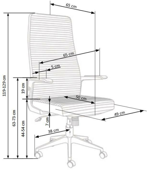• Wymiary: 65 cm (szerokość) x 65 cm (głębokość) x 119-129 cm (wysokość) z możliwością regulacji wysokości siedziska 44-54 cm.