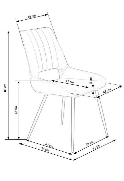 - Wymiary: 52 cm (szerokość) x 58 cm (głębokość) x 88 cm (wysokość), z wysokością siedziska wynoszącą 47 cm.