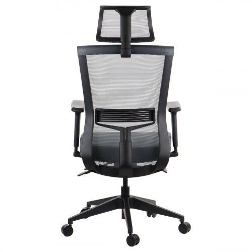 Siedzisko tapicerowane tkaniną w kolorze szarym, oparcie i zagłówek wykonane z z wysokiej jakości siatki w kolorze szarym.