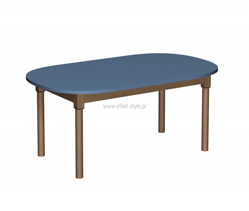 Stół przedszkolny z owalnym blatem o wymiarze 1200x700. Nogi o przekroju okrągłym, wykonane z drewna bukowego, lakierowane lakierem bezbarwnym.