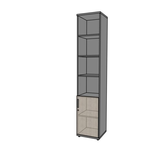 Szafka z nadstawką posiadająca 5 półek, w tym 4 zamykane 2 dużymi, dwuskrzydłowymi drzwiczkami. Środkowa półka jest otwarta. Szeroki wybór kolorystyki płyty meblowej.