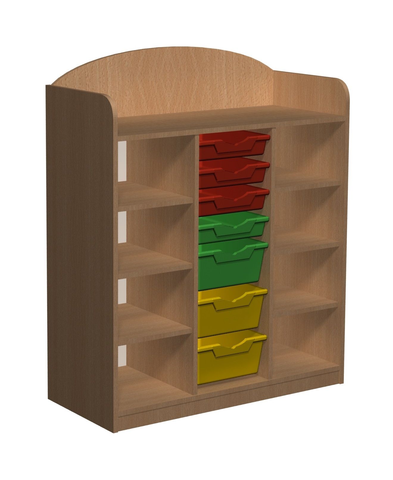 Szafka posiadająca 7 pojemników (4 małe i 3 średnie) w środkowej części i 8 otwartych półek w 2 skrajnych kolumnach.