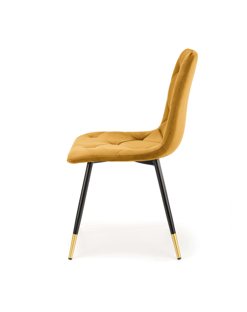 Krzesło K438 w odcieniu musztardowym to idealny wybór dla tych, którzy pragną dodać swojemu wnętrzu odrobinę elegancji i nowoczesnego stylu. Wykonane z wysokiej jakości tkaniny velvet, zapewnia nie tylko estetyczny wygląd, ale także wyjątkowy komfort użytkowania. Stalowe nogi w malowanej proszkowo czerni, zwieńczone złotymi akcentami, tworzą harmonijną całość, która przyciąga wzrok w każdym pomieszczeniu.