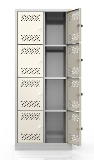 Skrytki rozmieszczone są w dwóch kolumnach po cztery rzędy. W każdej ze skrytek umieszczona jest półka na przybory szkolne. W drzwiach skrytek wykonane są otwory wentylacyjne.