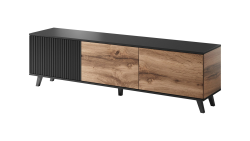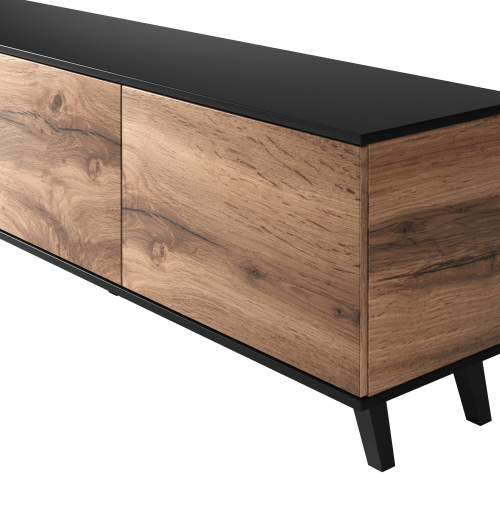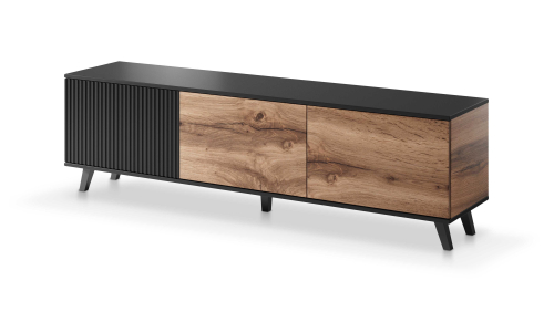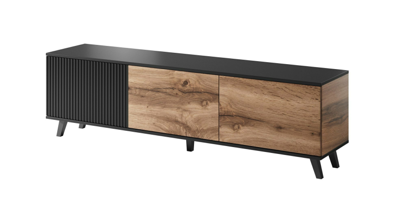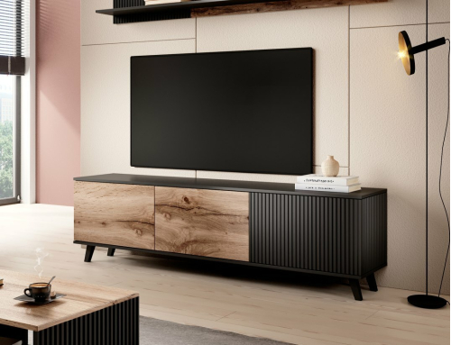 | Szafka RTV RANDOM RTV-2 – Nowoczesna Elegancja i Funkcjonalność w Twoim Salonie! Przedstawiamy szafkę RTV RANDOM RTV-2, która łączy w sobie stylowy design inspirowany stylem industrialnym i loftowym z nowoczesną funkcjonalnością. Jej charakterystyczne połączenie kolorystyczne dębu wotan i czerni tworzy wyrazisty mebel, który z pewnością stanie się centralnym punktem Twojej strefy rozrywki. Wyjątkowe Połączenie Kolorów i Detali: Szafka RTV RANDOM RTV-2 wyróżnia się nowoczesnym zestawieniem ciepłego odcienia dębu wotan z eleganckimi czarnymi nóżkami. Posiada troje drzwi, z czego jedne są czarne i posiadają ryflowaną strukturę, charakterystyczną dla kolekcji RANDOM. Pozostałe dwoje drzwi są w kolorze dębu wotan, tworząc interesujący kontrast. Funkcjonalność, Przestrzeń i Komfort Użytkowania: Dzięki wymiarom 180 cm szerokości, 40 cm głębokości i 52 cm wysokości, szafka RTV oferuje wystarczającą przestrzeń na Twój telewizor oraz sprzęt audio-wideo. Trzy zamknięte szafki z systemem otwierania na dotyk ("push to open") pomogą ukryć kable i inne akcesoria, utrzymując porządek w Twoim salonie i podkreślając minimalistyczny design. Wnętrze szafek zapewnia praktyczne miejsce do przechowywania. Wysoka Jakość Materiałów: Szafka RTV została wykonana z wysokiej jakości materiałów: płyty meblowej okleinowanej (dąb wotan) oraz MDF okleinowanego (czarne drzwi, w tym ryflowane), co gwarantuje jej trwałość i estetyczny wygląd na lata. Solidne nóżki z polipropylenu w kolorze czarnym zapewniają stabilność i dodają nowoczesnego akcentu. Stwórz Kompletną Aranżację z Kolekcją RANDOM: Z przyjemnością informujemy, że w naszej ofercie dostępna jest pełna kolekcja mebli RANDOM. Odkryj różnorodność stylowych i funkcjonalnych brył w spójnej palecie kolorystycznej dębu wotan i czerni. Dzięki temu z łatwością zaaranżujesz spójne i eleganckie wnętrze w całym swoim domu! Specyfikacja Produktu: -
