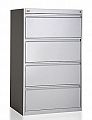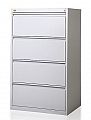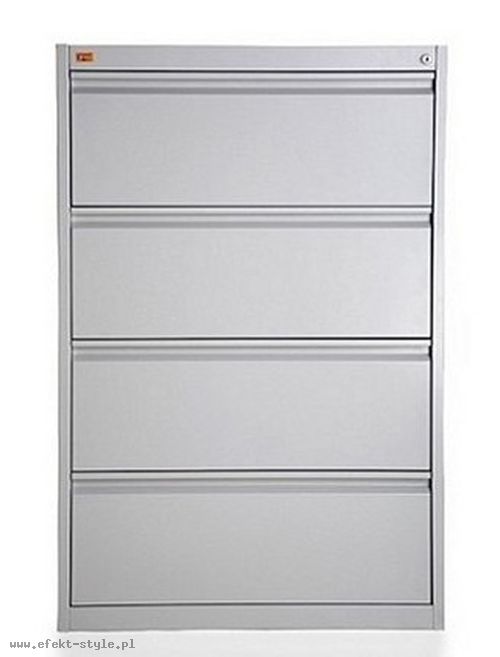 Czteroszufladowa szafa do przechowywania segregatorów oraz teczek zawieszkowych formatu A-4 w poziomie, w dwóch rzędach.