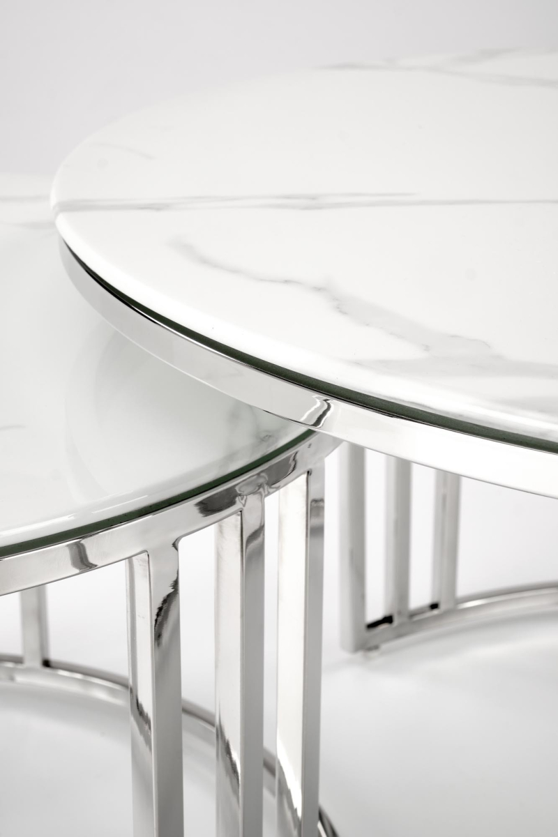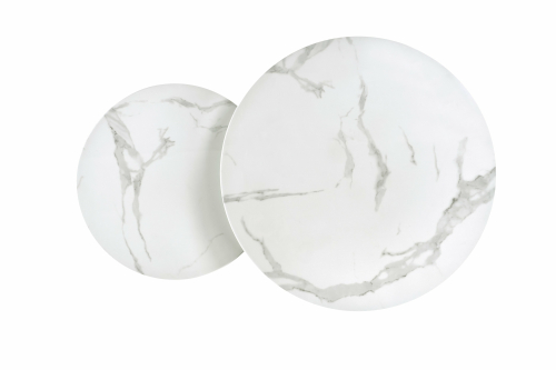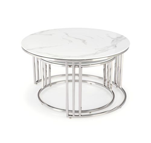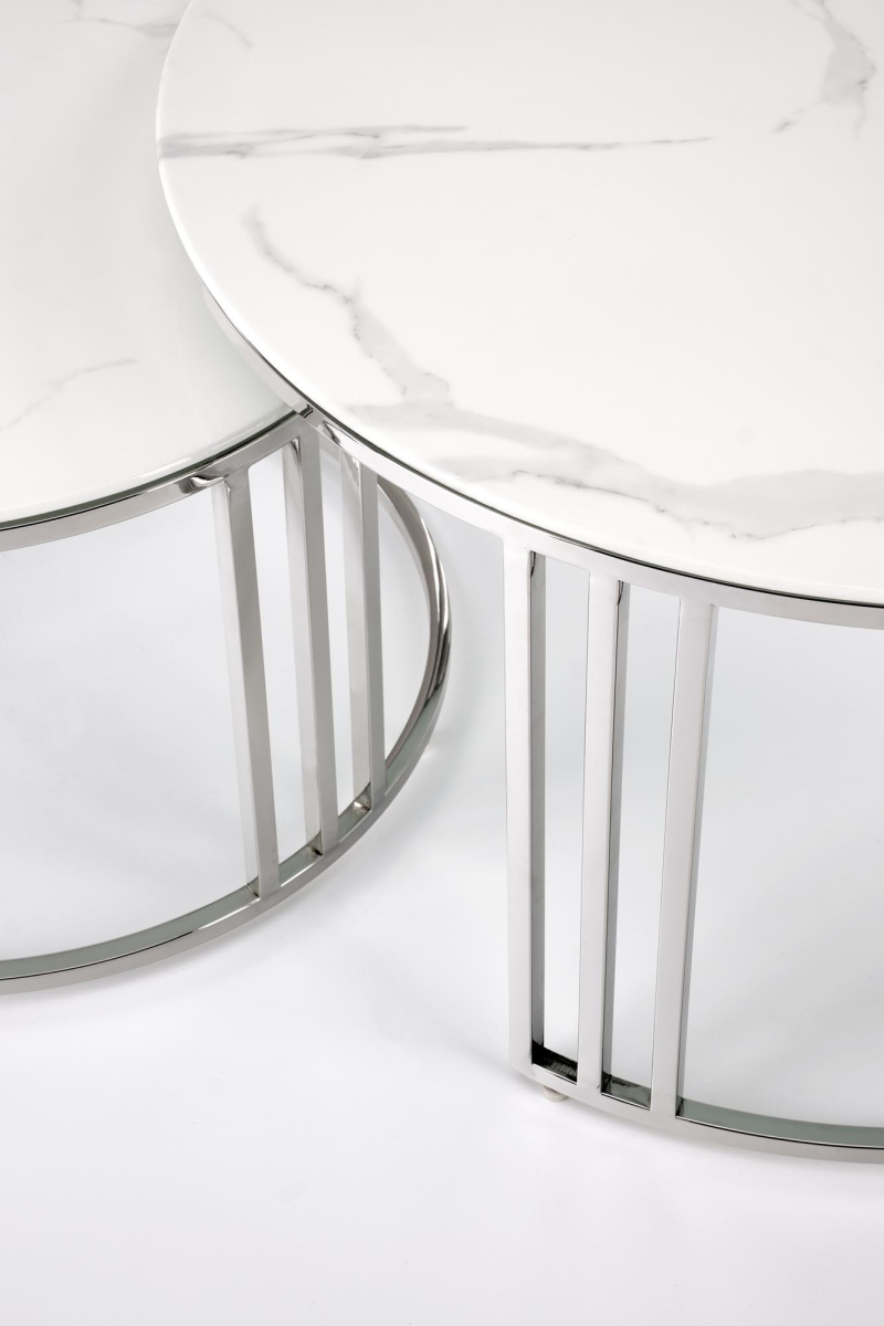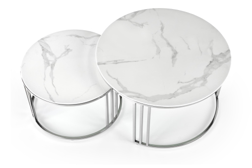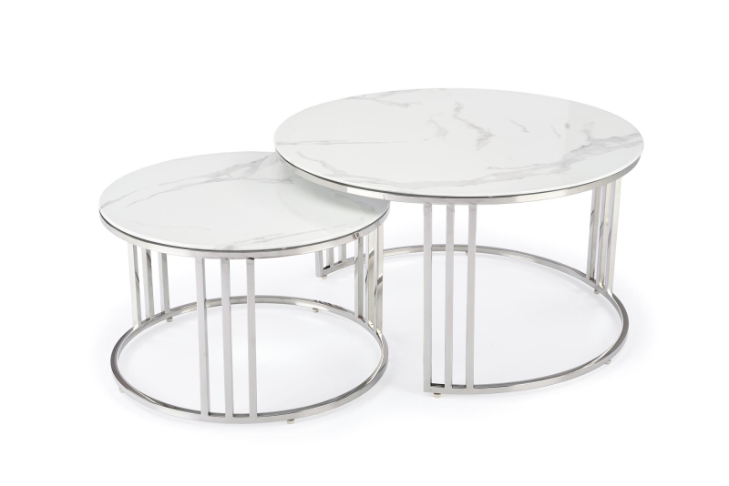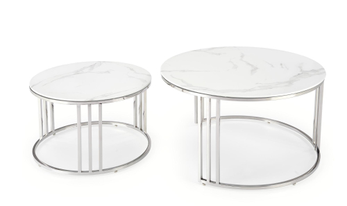 Ławy MERCURY 2 to połączenie wysokiej jakości szkła w eleganckim białym marmurze oraz stali nierdzewnej, której srebrny stelaż dodaje lekkości i nowoczesnego wyrazu. Dzięki zastosowaniu tych materiałów, meble są nie tylko estetyczne, ale również trwałe i łatwe w pielęgnacji. Biała marmurowa powierzchnia jest doskonała do wyeksponowania dekoracji, a stalowy stelaż zapewnia stabilność i wsparcie.