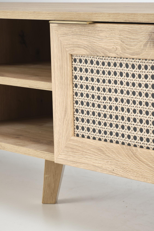 Stolik RTV jest nie tylko praktyczny, ale również estetyczny. Posiada dwie szuflady z koszyczkami, które stanowią świetny sposób na przechowywanie pilota, kabli i innych drobiazgów. Dodatkowa półka środkowa oferuje miejsce na sprzęt audio-wideo oraz wystawy dekoracji, co daje możliwość personalizacji wnętrza według własnych upodobań.