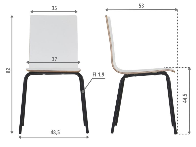 Wymiary Krzesło kubełkowe z grubą sklejką (11 mm), pokrytą wytrzymałym laminatem, gwarantuje solidność i łatwość utrzymania. Stelaż spawany o średnicy rurki 19 mm i grubości ścianki 2,2 mm zapewnia stabilność i trwałość.