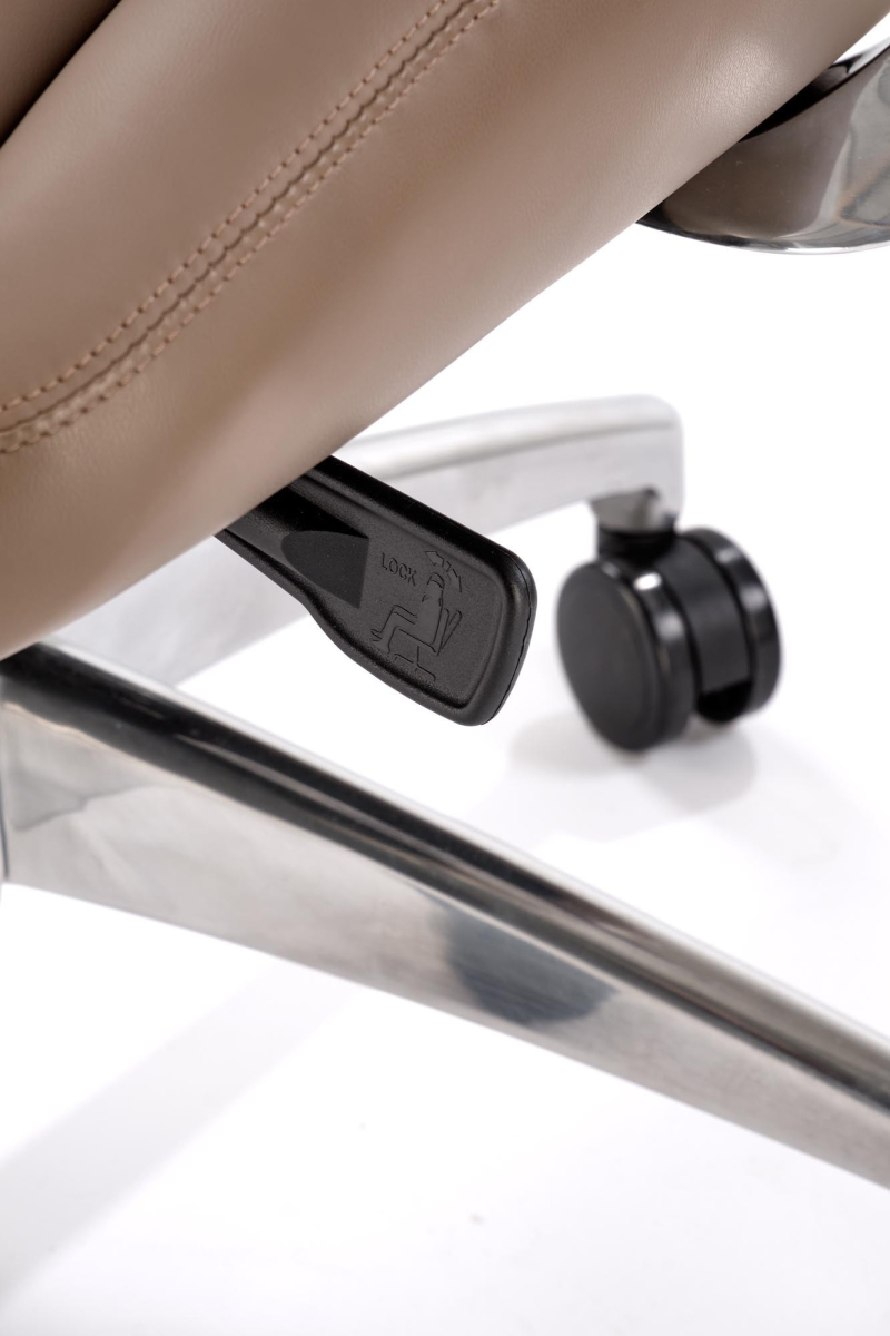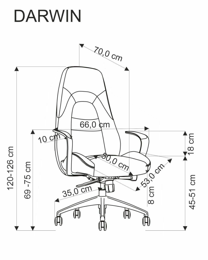 Fotel DARWIN charakteryzuje się funkcją MULTIBLOCK, która umożliwia swobodne rozłożenie oparcia w kilku pozycjach. Solidna aluminiowa podstawa zapewnia stabilność i trwałość, a aluminiowe podłokietniki dodają elegancji, będąc jednocześnie funkcjonalnym elementem. Wysokiej jakości eco skóra nie tylko nadaje fotelowi stylowy wygląd, ale również jest łatwa w utrzymaniu czystości, co jest nieocenione w codziennym użytkowaniu.