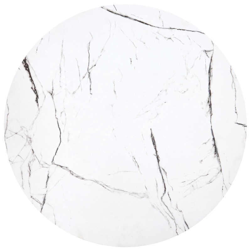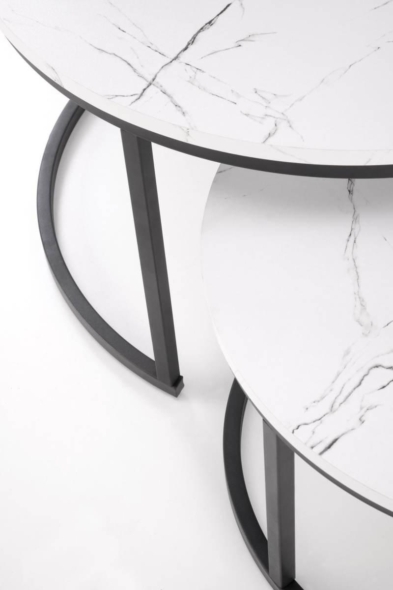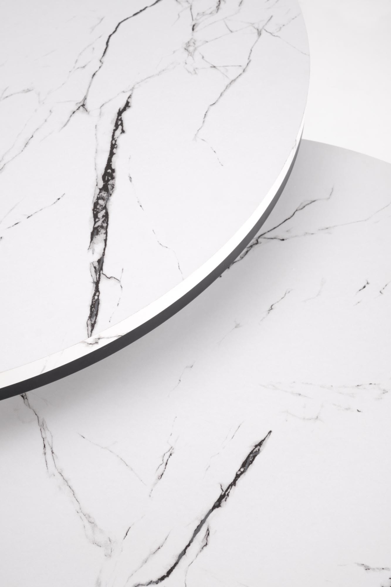 Blaty wykonane z MDF okleinowanego w kolorze białego marmuru prezentują się wyjątkowo stylowo i elegancko, a ich struktura nadaje całości wyrafinowanego charakteru. Kontrastujący z nimi czarny stelaż z malowanej proszkowo stali nie tylko gwarantuje solidność, ale także dodaje nowoczesności. Syntetyzacja tych dwóch kolorów sprawia, że zestaw pasuje do różnych stylów wnętrzarskich, od skandynawskiego po industrialny.