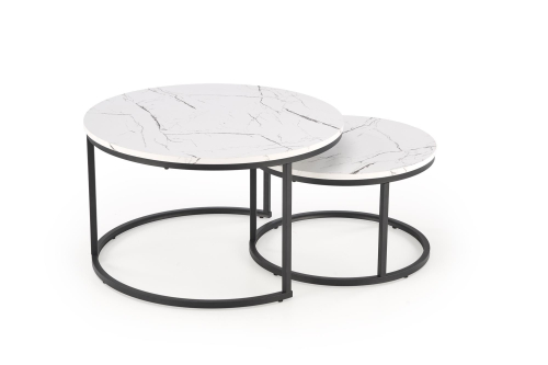 wymiary: 79/47 cm oraz 59/37 cm; zestaw 2 ław, materiał: MDF okleinowany / stal malowana proszkowo, kolory: biały marmur / czarny