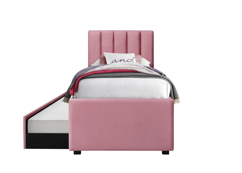 wymiary: 96/221/122 cm; łóżko dwuosobowe z wysuwanym dolnym materacem; materiał: tkanina - velvet, kolor: różowy; * łózko bez materaca, w opcji materac POLARIS 90 lub SYRIUSZ 90