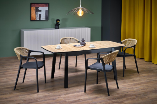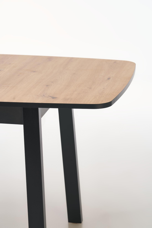 Stół wykonany jest z wysokiej jakości płyty meblowej laminowanej oraz MDF okleinowanego, co zapewnia trwałość oraz łatwość w utrzymaniu czystości. Blat w kolorze dębu artisan dodaje wnętrzu ciepła i naturalności, podczas gdy eleganckie, czarne nogi nadają mu współczesnego charakteru. Taka kolorystyka sprawia, że stół wpasuje się w różnorodne style aranżacji, od skandynawskiego po industrialny.