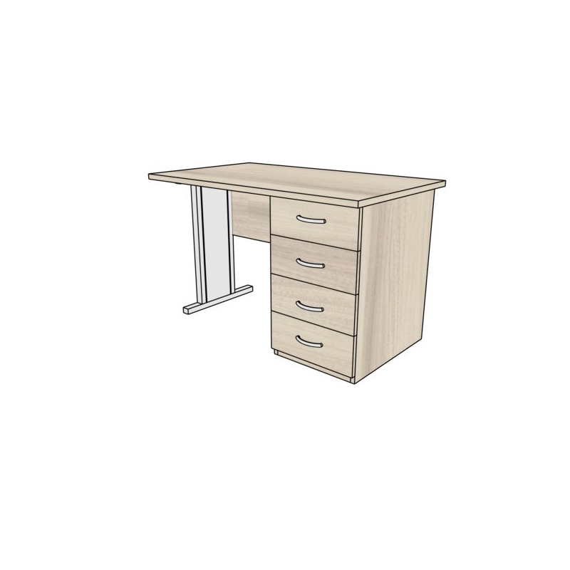 Proste biurka z kontenerem, który zamykany jest zamkiem centralnym z przeznaczeniem na wyposażenie biura lub gabinetu. Duży wybór kolorystyki płyty meblowej. Metalowy stelaż w kształcie odwróconej litery T z możliwością poprowadzenia kabli.