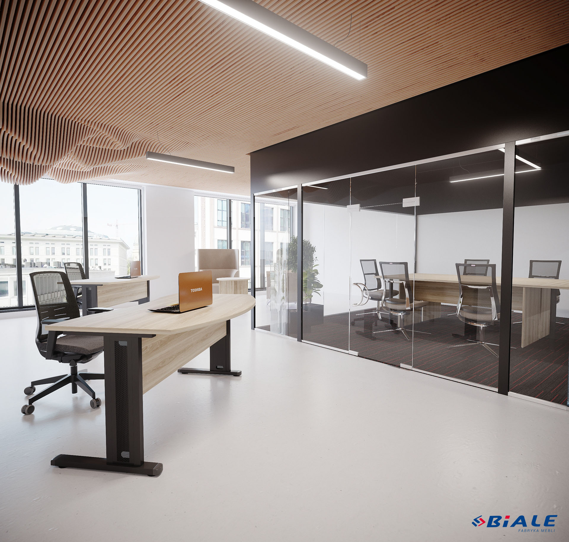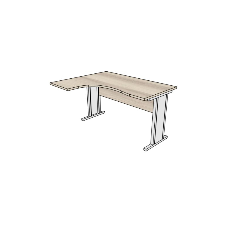 Kształtowe, ergonomiczne biurko z przeznaczeniem na wyposażenie biura lub gabinetu. Duży wybór kolorystyki płyty meblowej. Metalowy stelaż w kształcie odwróconej litery T z możliwością poprowadzenia kabli.