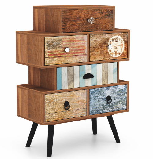 Kolorystyka wielobarwna komody MEZO KM-2 wprowadza do wnętrza elementy radości i energii. Każda szuflada zdobi unikalny wzór, co sprawia, że mebel staje się prawdziwą ozdobą każdego pomieszczenia. Urok vintage łączy się tutaj z nowoczesnym designem, co czyni tę komodę doskonałym wyborem dla każdego, kto ceni sobie nietuzinkowe rozwiązania w aranżacji przestrzeni.