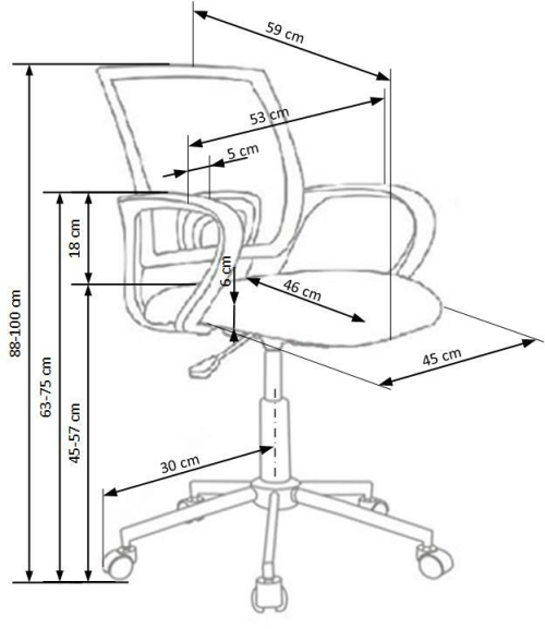 Wymiary krzesła są równie przemyślane, gdyż jego szerokość wynosi 53 cm, głębokość 59 cm, a wysokość waha się od 88 do 100 cm. Dzięki tej konstrukcji, krzesło może dostosować się do potrzeb użytkownika, zapewniając jednocześnie wygodę siedzenia podczas długich godzin pracy. Chromowana podstawa z kółkami zapewnia nie tylko elegancki wygląd, ale również łatwość w poruszaniu się po pomieszczeniu, co zwiększa komfort codziennego użytkowania.