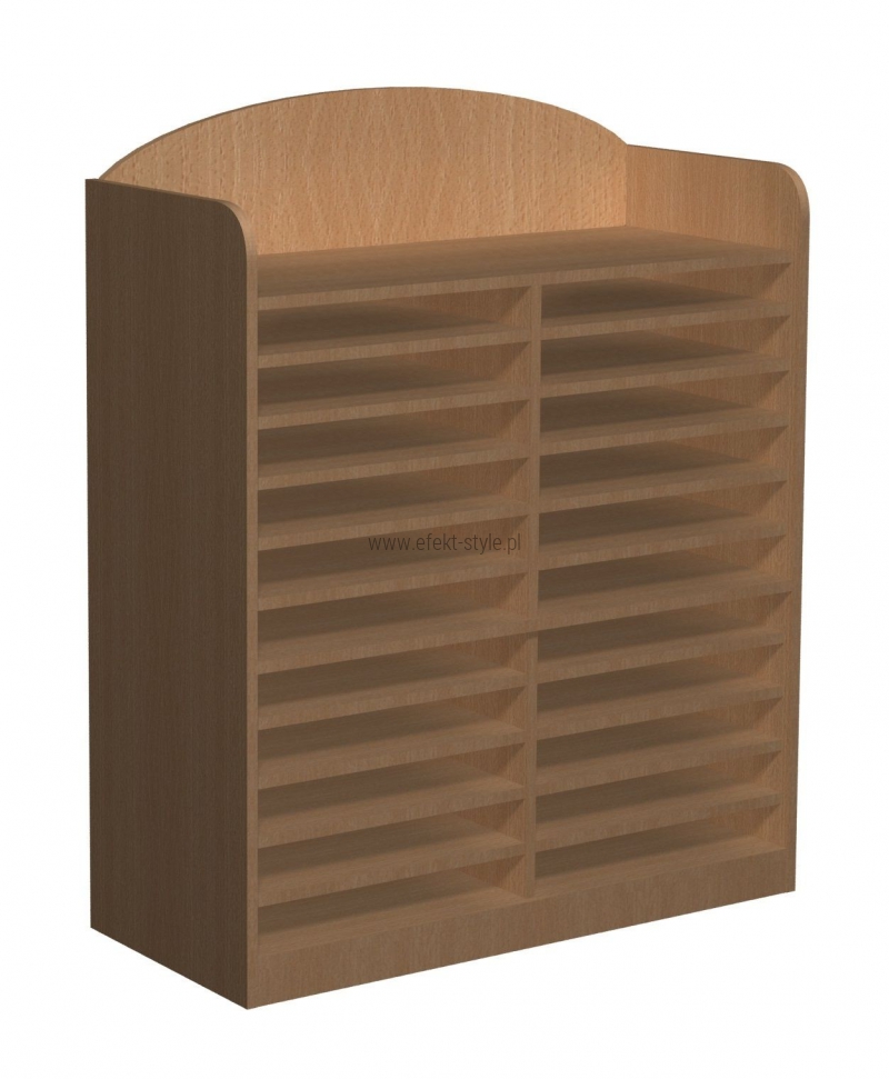 Szafka z nadstawką na prace plastyczne posiadająca 22 otwartych półek w 2 kolumnach.