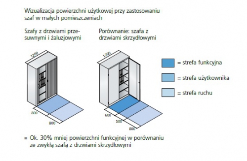 Szafy żaluzjowe nie wymagają w projektowaniu biura uwzględnienia powierzchni funkcyjnej. Tym samym można uzyskać dodatkowe miejsce do pracy, co jest również oszczędnością kosztów, gdyż powierzchnie biurowe są drogie.