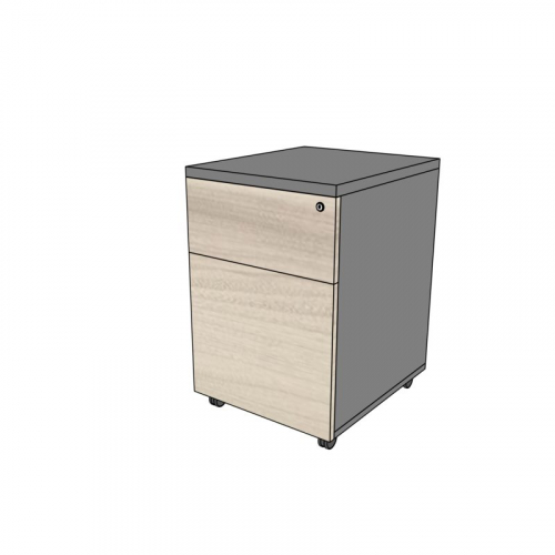 Kontenery wykonane z płyty 25 mm obustronnie laminowanej o podwyższonej trwałości. Krawędzie boczne wykończone obrzeżem PCV 2mm. Wieniec górny grubość 25mm, korpus, ściana tylna, wieniec dolny oraz fronty 18mm. W kontenerach z szufladami zamontowany jest zamek centralny z dwona kluczami, zamykający równocześnie wszystkie szuflady. Dodatkowy element wyposażenia szuflady kontenera stanowi piórnik nakładany PM w kolorze czarnym.