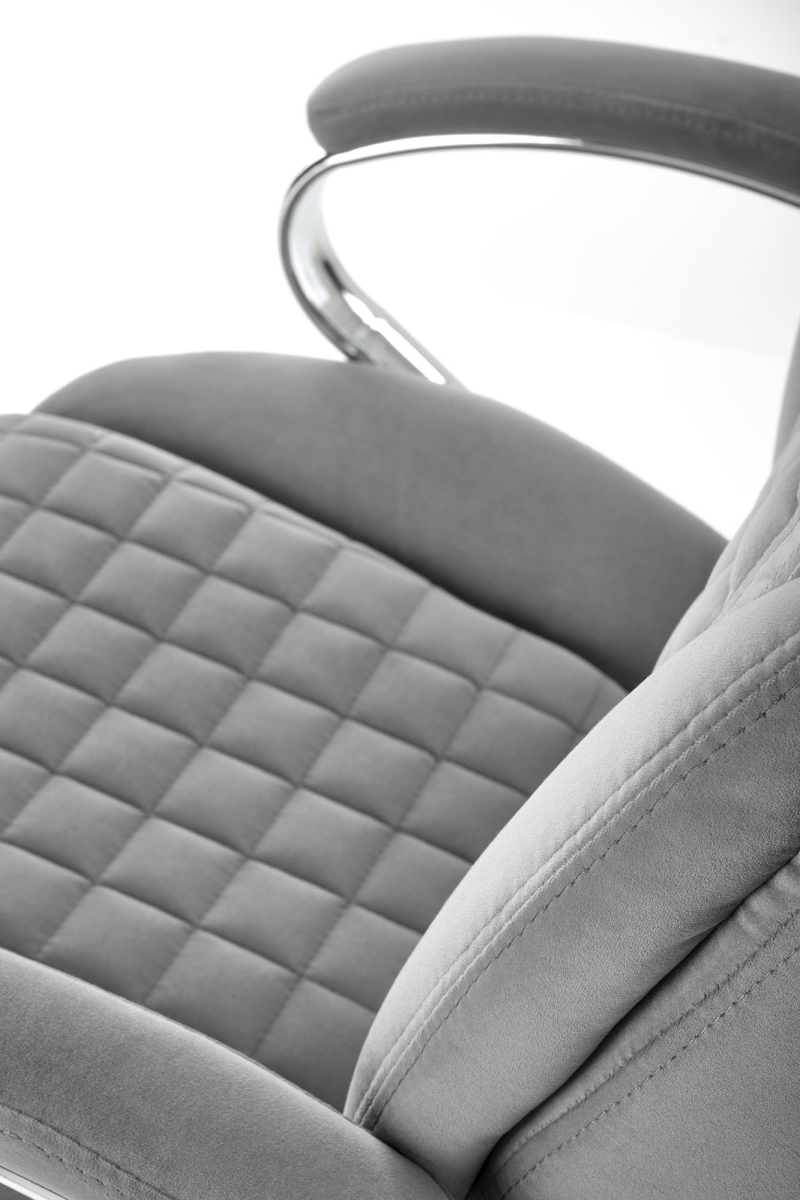 Tapicerowany fotel obrotowy tkaniną typu velvet w kolorze popielatym.