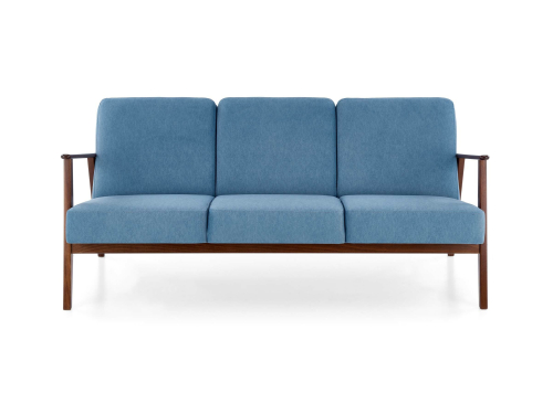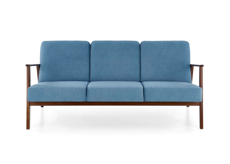 Sofa MILANO 3S obita jest wysokiej jakości tkaniną CASTEL w niebieskim kolorze (CASTEL#74), która zachwyca nie tylko swoją miękkością, ale także trwałością i łatwością w utrzymaniu czystości. Solidna konstrukcja wykonana z litego drewna bukowego w ciepłym odcieniu ciemny orzech gwarantuje stabilność i dodaje sofie szlachetnego charakteru.