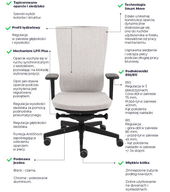 • mechanizm synchroniczny – popularną możliwością tych foteli biurowych jest funkcja Active, a więc synchroniczne odchylanie się siedziska i oparcia. Oferują też narzędzie “Anti-Shock”, czyli zabezpieczenie przed uderzeniem oparcia w plecy użytkownika. Kolejnym plusem, jakim mogą pochwalić się te krzesła biurowe jest mechanizm Epron Syncro, który pozwala zablokować oparcie w kilku pozycjach. Posiada też szeroki zakres jednoczesnego odchylania siedziska i oparcia,