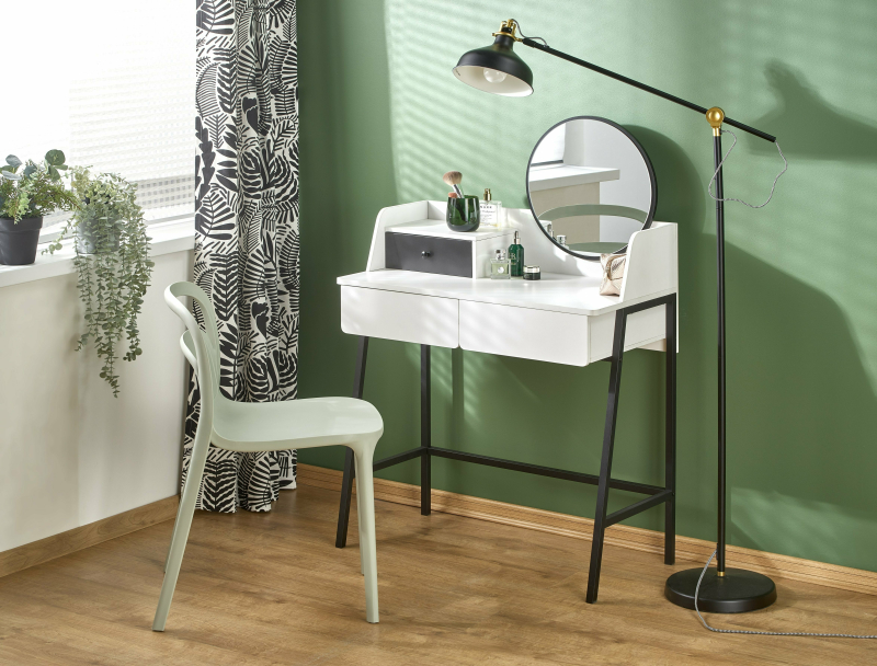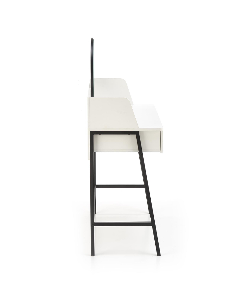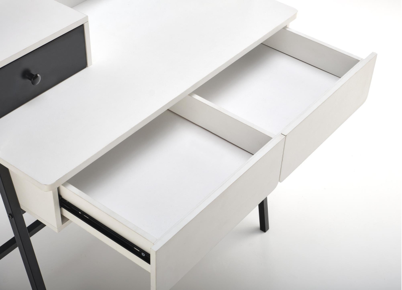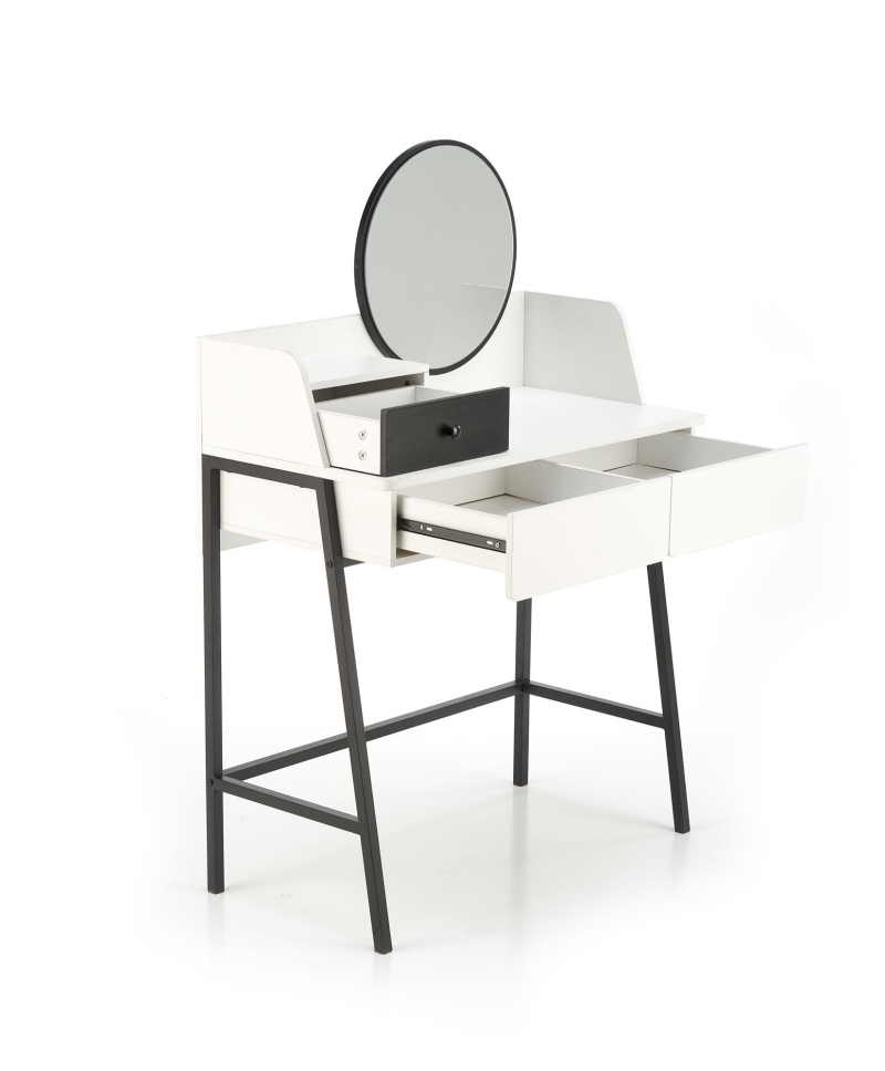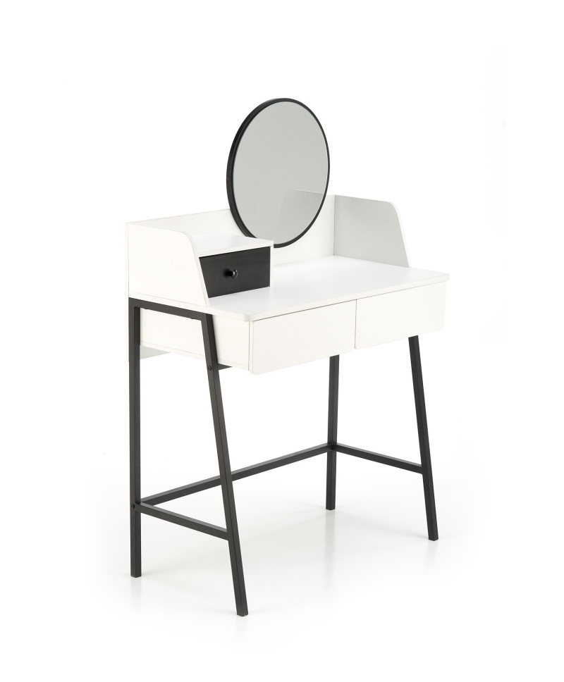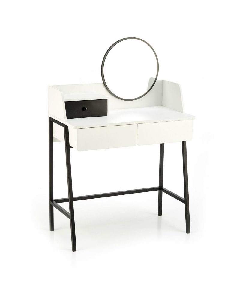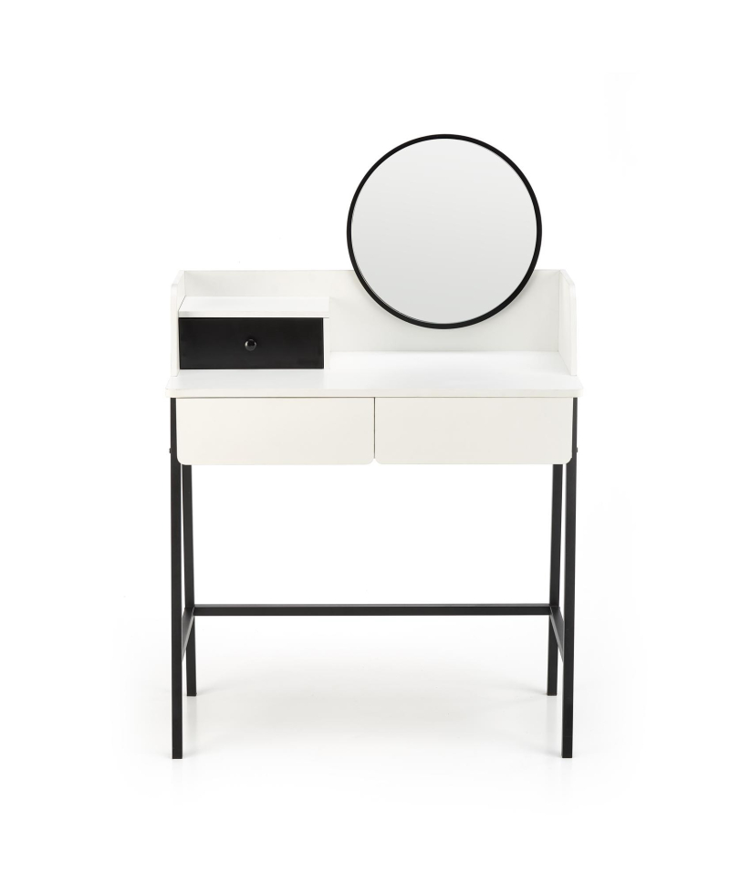 Konsolka AGNES - biało-czarnaElegancka i minimalistyczna konsolka AGNES to idealne rozwiązanie dla tych, którzy cenią sobie funkcjonalność połączoną z nowoczesnym designem. Dzięki swoim kompaktowym wymiarom (80 cm szerokości, 42 cm głębokości, 100 cm wysokości) doskonale sprawdzi się zarówno w sypialni jako toaletka, jak i w przedpokoju jako stylowa konsola. Mebel wykonano z wysokiej jakości materiałów: