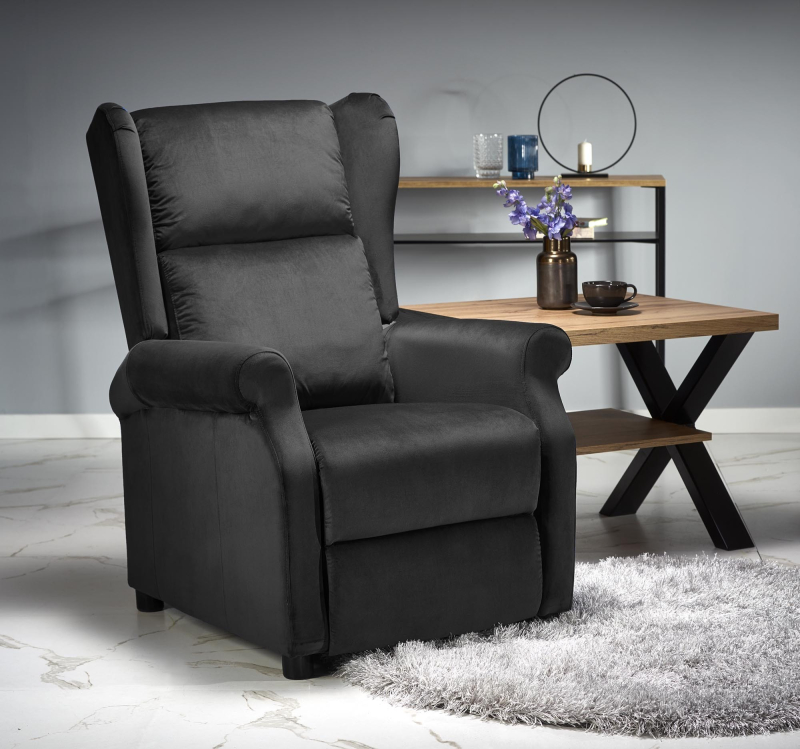 Fotel wypoczynkowy AGUSTIN 2 to elegancki dodatek do każdego wnętrza, który łączy w sobie nowoczesny design z najwyższym komfortem. Wykonany z luksusowej tkaniny velvet w głębokim, czarnym kolorze (BLUVEL 19), fotel doskonale komponuje się zarówno w modnych, jak i klasycznych aranżacjach. Jego funkcjonalność sprawia, że jest idealnym miejscem do relaksu po długim dniu.