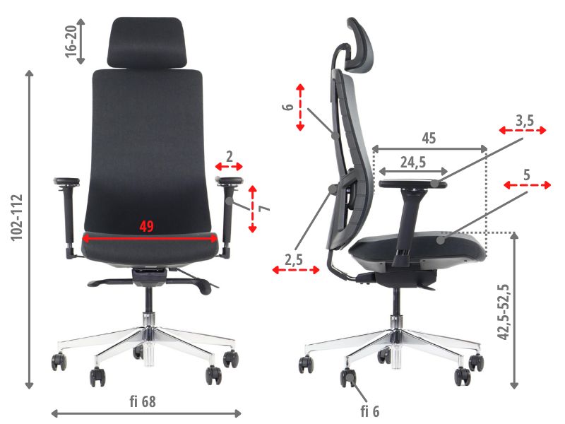 zdjęcia mechanizm synchroniczny MS-APROM-SY Specyfikacja mechanizmu: -mechanizm rozłączny - osobno mechanizm, osobno łącznik oparcia -zsynchronizowana regulacja kąta pochylenia oparcia i siedziska, za pomocą jednej dźwigni/przycisku (zakres pochylenia siedzisko: -1°/+10°; oparcie: 20°) -regulacja natężenia za pomocą pokrętła dolnego -regulacja kolumny gazowej, za pomocą dźwigni/przycisku -możliwość korzystania z mechanizmu w pozycji nie zablokowanej i zablokowanej -blokowanie w 5 pozycjach -antishock - ochrona pleców przed uderzeniem oparcia po zwolnieniu blokady -przesuw siedziska - zewnętrzny (opcja za dopłatą) podłokietniki Do wyboru: regulowane góra - dół miękka nakładka czarne lub regulacja góra-dół w zakresie 75mm przesuw nakładki przód-tył w zakresie 60mm obrót nakładki +/- 30 stopni podstawa Do wyboru: czarna z tworzywa aluminiowa Kółka: twarde do powierzchni miękkich - standard miękkie do powierzchni twardych (dopłata) Oparcie i siedzisko Oparcie i siedzisko wyprofilowane, wykonane z pianki integralnej. Oparcie zostało wyposażone w regulacje: oparcie regulowane na wysokości, podparcie lędźwiowe regulowane w wysokości które umożliwiaja dopasowanie fotela do naszej sylwetki. Siedzisko i oparcie: tapicerowane wg wzornika. tapicerki/siatki oznaczone gwiazdką (*) - wymagają indywidualnego ustalenia minimalnej ilości zamawianych foteli. zagłówek Model fotela dostepny w wersji: bez zagłówka - standard(A) z zagłówkiem stałym - za dopłatą(T) Do wyboru w KONFIGURATORZE Wymiary Fotel APOLLO bez zagłówka Fotel APOLLO z zagłówkiem Atest Fotel posiada Atest badań wytrzymałościowych i bezpieczeństwa użytkowania przez ludzi o masie do 150 kg Montaż Do samadzielnego montażu