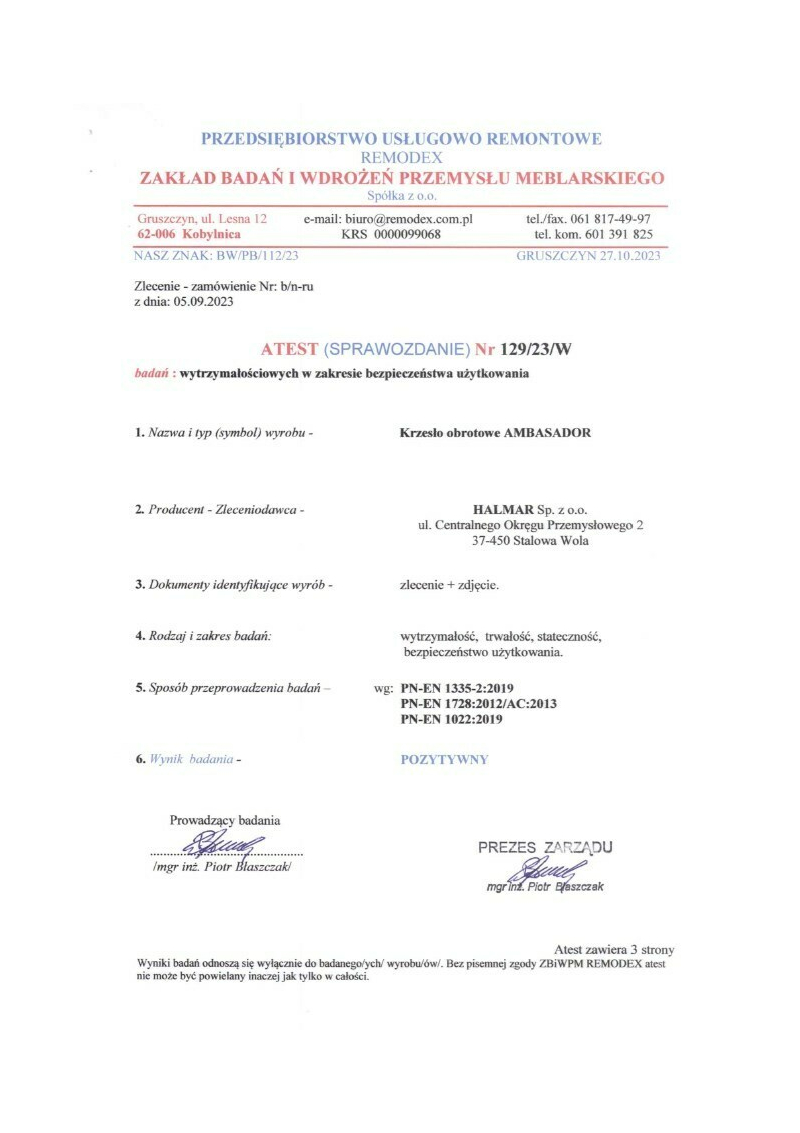 Atest | Badania przeprowadzono zgodnie z normą: PN-EN 1335-2:2019 PN-EN 1728:2012/AC :2013 PN-EN 1022:2019 | |