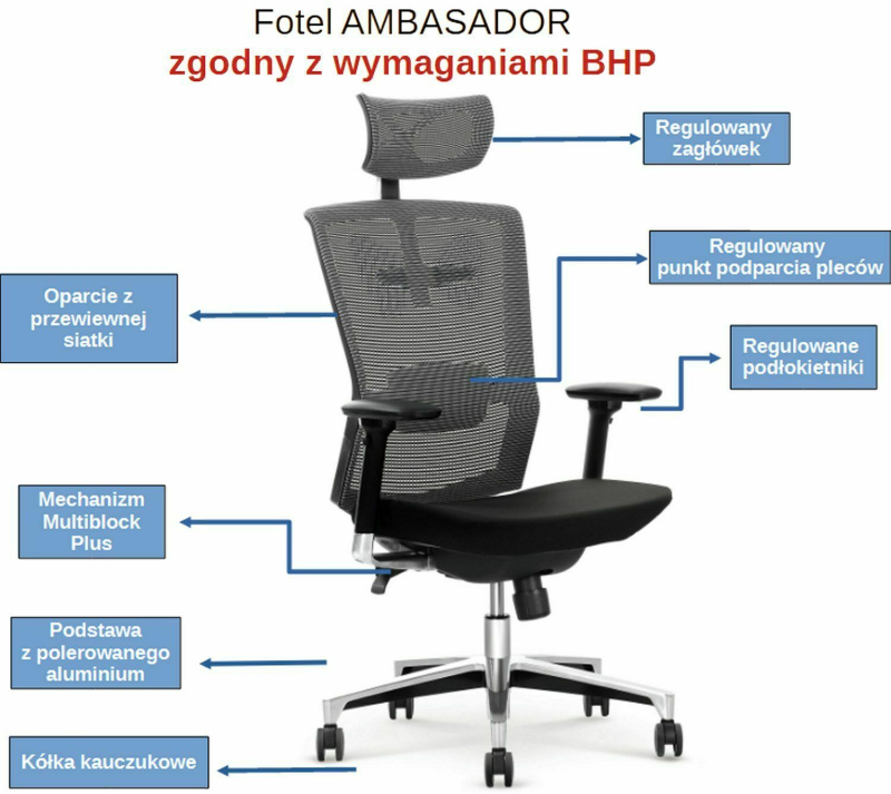 Fotel biurowy obrotowy ErgoNew A1F siedzisko siatkowe z podnóżkiem Fotel biurowy ERGONEW A1F: Ergonomia, komfort, funkcjonalność i styl Fotele biurowe są nieodłącznym elementem wyposażenia każdego miejsca pracy. Wpływają one na nasze samopoczucie, wydajność i zdrowie podczas wielu godzin spędzonych przy biurku. Jeśli szukasz fotela, który zapewni Ci doskonałe wsparcie ergonomiczne, trwałość i estetykę, warto zwrócić uwagę na fotel biurowy obrotowy ERGONEW. Ten nowoczesny model łączy w sobie innowacyjne rozwiązania z wysokiej jakości materiałami, zapewniając niezrównany komfort i wygodę. Główne atuty fotela to: ✅ łatwa i intuicyjna obsługa mechanizmami fotela ✅ regulacja wysokości oparcia z podparciem lędźwiowym ✅ regulacja wysokości, odchyłu realizowana za pomocą przycisków przy siedzisku ✅ regulowany zagłówek 3D ✅ regulowane podłokietniki 3D Ponadto regulacja wysokości, odchyłu i wysuwu siedziska to kluczowe funkcje, które pozwalają dostosować fotel do indywidualnych preferencji użytkownika. W fotelu ERGONEW regulacja ta odbywa się za pomocą przycisków umiejscowionych przy siedzisku, co zapewnia wygodny i intuicyjny sposób dostosowywania pozycji siedzenia. Podsumowując: Fotel biurowy obrotowy ERGONEW to idealne rozwiązanie dla osób, które cenią sobie komfort, ergonomię i wysoką jakość wykonania. Dzięki jego zaawansowanym regulacjom i solidnej konstrukcji, zapewnia on optymalne wsparcie podczas długotrwałego siedzenia przy biurku. Wygodne siedzisko, regulowane podłokietniki, zagłówek i oparcie sprawiają, że praca staje się bardziej komfortowa i efektywna. Fotel ERGONEW to doskonały wybór dla wszystkich, którzy dbają o swoje zdrowie i dobre samopoczucie w miejscu pracy. Dane techniczne fotela biurowego ErgoNew A1F z podnóżkiem Oparcie ✅ wykonane z wytrzymałej siatki, zapewniającej przepływ powietrza, co wpływa na komfort pracy. ✅regulowane na wysokości - regulacja wysokości oparcia umożliwia dostosowanie go do krzywizny kręgosłupa, co pomaga utrzymać prawidłową postawę ciała. Kolor czarny Zagłówek ✅ regulowany zagłówek 3D, który umożliwia dopasowanie wysokości oraz nachylenia zagłówka do indywidualnych potrzeb. Dzięki temu można uzyskać optymalne podparcie dla szyi i głowy, co wpływa na komfort i redukcję napięcia mięśniowego. Podparcie Lędźwiowe Fotel ERGONEW został wyposażony w ✅ wyprofilowanie lędźwiowe z regulacją wysokości, która współpracuje z oparciem. Ta funkcja umożliwia dopasowanie podparcia dla kręgosłupa w okolicach odcinka lędźwiowego, co jest istotne dla zachowania prawidłowej postawy ciała i uniknięcia bólu pleców. Łącznik/rama oparcia Łącznik wykonany jest z aluminium Siedzisko wykonane z tkaniny siatkowej, zapewniającej przepływ powietrza, co wpływa na komfort pracy. Kolor czarny Podnóżek Wysuwany podnóżek Wysuw siedziska Fotel posiada: ✅ funkcję wysuwu siedziska, która umożliwia dostosowanie głębokości siedziska do długości ud. To szczególnie istotne dla osób o różnej wysokości ciała, które chcą uzyskać optymalne podparcie dla ud i zapewnić odpowiednią krążenie krwi. Mechanizm synchroniczny ✅ 4-pozycyjny mechanizm synchro z funkcją "anti-shock" zapewnia płynne przemieszczanie się oparcia bez uderzenia w plecy po zwolnieniu blokady. Możliwość regulacji siły oporu mechanizmu synchro pozwala dostosować fotel do indywidualnych preferencji. Regulacja wysokości i odchyłu odbywa się za pomocą przycisków umiejscowionych przy siedzisku Podłokietniki Regulowane podłokietniki 3D to kolejny atut fotela ERGONEW. ✅ Możliwość regulacji: - góra - dół - przesuw nakładki przód - tył - kąt obrotu nakładki podłokietników pozwala na dostosowanie ich do indywidualnych preferencji i zapewnienie odpowiedniego wsparcia dla ramion i nadgarstków. Miękkie nakładki zapewniają dodatkowy komfort podczas korzystania z fotela przez dłuższy czas. Podnośnik ✅ Podnośnik klasy 4 to gwarancja niezawodności i płynnej regulacji wysokości siedziska. Dzięki tej funkcji można dostosować wysokość siedziska do swojego biurka. Podstawa/kółka Podstawa fotela wykonana z aluminium kółka miękkie fi 60 mm przystosowane do powierzchni twardych Atest Gwarancją jakości fotela jest ✅ ATEST wytrzymałościowy w zakresie bezpieczeństwa użytkowania, zgodność z normami: PN-EN 1335-2:2019-03, PN-EN 1728:2012/AC:2013 PN-EN 1022:2024-04 max obciązenie siedziska - 150 kg Montaż Do samodzielnego montażu , instrukcja dołączona do przesyłki. Gwarancja 24 miesiące Wymiary Wysokość całkowita bez zagłówka 106-115 cm Wysokość położenia siedziska 49 - 58 cm Wysokość oparcia regulowane w zakresie + 5 cm Szerokość siedziska 50 cm Podstawa fi 70 cm UWAGA: Podane wymiary magą różnić się o +/- 1-2 cm. Poniżej przedstawiamy tabele porównawczą foteli biurowych z serii ErgoNew: funkcje/model ErgoNew A1 ErgoNew A1 F ErgoNew S1 ErgoNew S1A ErgoNew S7 ErgoNew S8 Regulacja zagłówka 3D 3D 3D 3D Góra-dół 2D Regulacja podłokietników 3D 3D 3D 3D 3D 3D Regulacja wysokości oparcia tak tak tak tak tak tak Wysuw siedziska tak tak nie tak tak tak Rodzaj podstawy aluminium aluminium nylon aluminium aluminium aluminium Kółka miękkie Tak/60 mm Tak/60 mm Tak/60 mm Tak/65 mm Tak/65 mm Tak/65 mm Łącznik oparcia – wykonanie aluminium aluminium metal metal aluminium aluminium Rama oparcia aluminium aluminium nylon nylon nylon aluminium Korpus podłokietnika metal metal aluminium aluminium Zobacz pozostałe modele z tej serii: