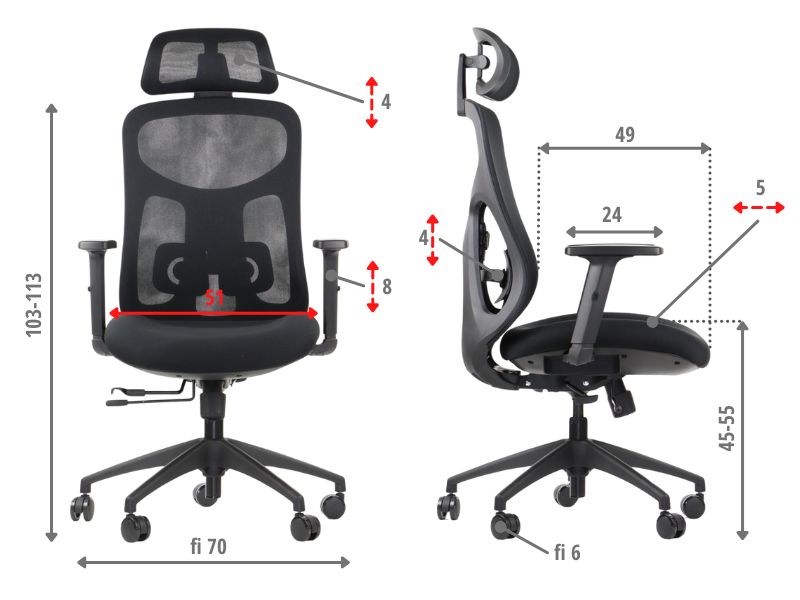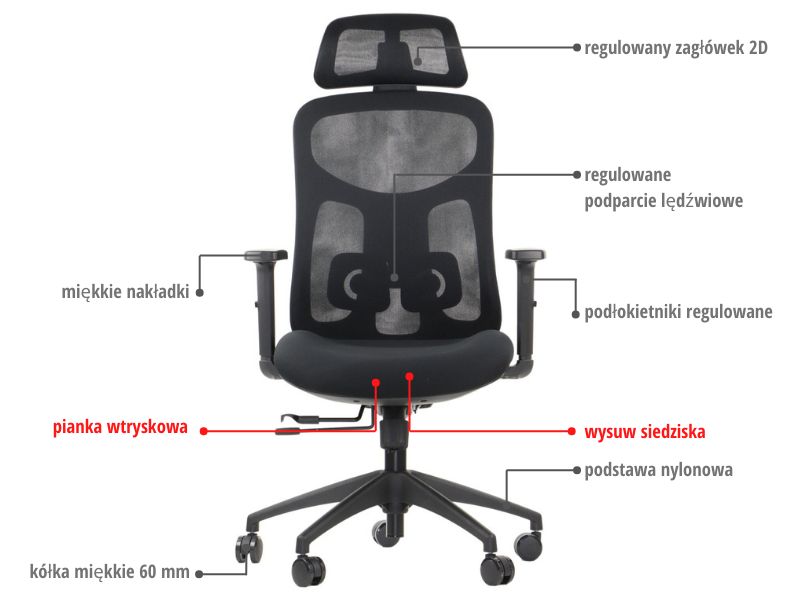 Fotel biurowy obrotowy ErgoNew A1F siedzisko siatkowe z podnóżkiem Fotel biurowy ERGONEW A1F: Ergonomia, komfort, funkcjonalność i styl Fotele biurowe są nieodłącznym elementem wyposażenia każdego miejsca pracy. Wpływają one na nasze samopoczucie, wydajność i zdrowie podczas wielu godzin spędzonych przy biurku. Jeśli szukasz fotela, który zapewni Ci doskonałe wsparcie ergonomiczne, trwałość i estetykę, warto zwrócić uwagę na fotel biurowy obrotowy ERGONEW. Ten nowoczesny model łączy w sobie innowacyjne rozwiązania z wysokiej jakości materiałami, zapewniając niezrównany komfort i wygodę. Główne atuty fotela to: ✅ łatwa i intuicyjna obsługa mechanizmami fotela ✅ regulacja wysokości oparcia z podparciem lędźwiowym ✅ regulacja wysokości, odchyłu realizowana za pomocą przycisków przy siedzisku ✅ regulowany zagłówek 3D ✅ regulowane podłokietniki 3D Ponadto regulacja wysokości, odchyłu i wysuwu siedziska to kluczowe funkcje, które pozwalają dostosować fotel do indywidualnych preferencji użytkownika. W fotelu ERGONEW regulacja ta odbywa się za pomocą przycisków umiejscowionych przy siedzisku, co zapewnia wygodny i intuicyjny sposób dostosowywania pozycji siedzenia. Podsumowując: Fotel biurowy obrotowy ERGONEW to idealne rozwiązanie dla osób, które cenią sobie komfort, ergonomię i wysoką jakość wykonania. Dzięki jego zaawansowanym regulacjom i solidnej konstrukcji, zapewnia on optymalne wsparcie podczas długotrwałego siedzenia przy biurku. Wygodne siedzisko, regulowane podłokietniki, zagłówek i oparcie sprawiają, że praca staje się bardziej komfortowa i efektywna. Fotel ERGONEW to doskonały wybór dla wszystkich, którzy dbają o swoje zdrowie i dobre samopoczucie w miejscu pracy. Dane techniczne fotela biurowego ErgoNew A1F z podnóżkiem Oparcie ✅ wykonane z wytrzymałej siatki, zapewniającej przepływ powietrza, co wpływa na komfort pracy. ✅regulowane na wysokości - regulacja wysokości oparcia umożliwia dostosowanie go do krzywizny kręgosłupa, co pomaga utrzymać prawidłową postawę ciała. Kolor czarny Zagłówek ✅ regulowany zagłówek 3D, który umożliwia dopasowanie wysokości oraz nachylenia zagłówka do indywidualnych potrzeb. Dzięki temu można uzyskać optymalne podparcie dla szyi i głowy, co wpływa na komfort i redukcję napięcia mięśniowego. Podparcie Lędźwiowe Fotel ERGONEW został wyposażony w ✅ wyprofilowanie lędźwiowe z regulacją wysokości, która współpracuje z oparciem. Ta funkcja umożliwia dopasowanie podparcia dla kręgosłupa w okolicach odcinka lędźwiowego, co jest istotne dla zachowania prawidłowej postawy ciała i uniknięcia bólu pleców. Łącznik/rama oparcia Łącznik wykonany jest z aluminium Siedzisko wykonane z tkaniny siatkowej, zapewniającej przepływ powietrza, co wpływa na komfort pracy. Kolor czarny Podnóżek Wysuwany podnóżek Wysuw siedziska Fotel posiada: ✅ funkcję wysuwu siedziska, która umożliwia dostosowanie głębokości siedziska do długości ud. To szczególnie istotne dla osób o różnej wysokości ciała, które chcą uzyskać optymalne podparcie dla ud i zapewnić odpowiednią krążenie krwi. Mechanizm synchroniczny ✅ 4-pozycyjny mechanizm synchro z funkcją "anti-shock" zapewnia płynne przemieszczanie się oparcia bez uderzenia w plecy po zwolnieniu blokady. Możliwość regulacji siły oporu mechanizmu synchro pozwala dostosować fotel do indywidualnych preferencji. Regulacja wysokości i odchyłu odbywa się za pomocą przycisków umiejscowionych przy siedzisku Podłokietniki Regulowane podłokietniki 3D to kolejny atut fotela ERGONEW. ✅ Możliwość regulacji: - góra - dół - przesuw nakładki przód - tył - kąt obrotu nakładki podłokietników pozwala na dostosowanie ich do indywidualnych preferencji i zapewnienie odpowiedniego wsparcia dla ramion i nadgarstków. Miękkie nakładki zapewniają dodatkowy komfort podczas korzystania z fotela przez dłuższy czas. Podnośnik ✅ Podnośnik klasy 4 to gwarancja niezawodności i płynnej regulacji wysokości siedziska. Dzięki tej funkcji można dostosować wysokość siedziska do swojego biurka. Podstawa/kółka Podstawa fotela wykonana z aluminium kółka miękkie fi 60 mm przystosowane do powierzchni twardych Atest Gwarancją jakości fotela jest ✅ ATEST wytrzymałościowy w zakresie bezpieczeństwa użytkowania, zgodność z normami: PN-EN 1335-2:2019-03, PN-EN 1728:2012/AC:2013 PN-EN 1022:2024-04 max obciązenie siedziska - 150 kg Montaż Do samodzielnego montażu , instrukcja dołączona do przesyłki. Gwarancja 24 miesiące Wymiary Wysokość całkowita bez zagłówka 106-115 cm Wysokość położenia siedziska 49 - 58 cm Wysokość oparcia regulowane w zakresie + 5 cm Szerokość siedziska 50 cm Podstawa fi 70 cm UWAGA: Podane wymiary magą różnić się o +/- 1-2 cm. Poniżej przedstawiamy tabele porównawczą foteli biurowych z serii ErgoNew: funkcje/model ErgoNew A1 ErgoNew A1 F ErgoNew S1 ErgoNew S1A ErgoNew S7 ErgoNew S8 Regulacja zagłówka 3D 3D 3D 3D Góra-dół 2D Regulacja podłokietników 3D 3D 3D 3D 3D 3D Regulacja wysokości oparcia tak tak tak tak tak tak Wysuw siedziska tak tak nie tak tak tak Rodzaj podstawy aluminium aluminium nylon aluminium aluminium aluminium Kółka miękkie Tak/60 mm Tak/60 mm Tak/60 mm Tak/65 mm Tak/65 mm Tak/65 mm Łącznik oparcia – wykonanie aluminium aluminium metal metal aluminium aluminium Rama oparcia aluminium aluminium nylon nylon nylon aluminium Korpus podłokietnika metal metal aluminium aluminium Zobacz pozostałe modele z tej serii: