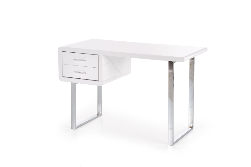 Biurko B30 to idealne połączenie nowoczesności i elegancji, które wpisuje się w różnorodne style wnętrzarskie. Jego minimalistyczna forma, wykonana z lakierowanego na wysoki połysk MDF, nadaje pomieszczeniu lekkości, a jednocześnie wyjątkowego charakteru. Białe wykończenie sprawia, że biurko jest uniwersalne i łatwo wkomponuje się w każdą aranżację, od klasycznej po nowoczesną. Chromowane nogi dodają całości nowoczesnego sznytu oraz zwiększają stabilność mebla. Wymiary biurka wynoszą 120 cm długości, 55 cm szerokości oraz 76 cm wysokości, co sprawia, że jest to perfekcyjne rozwiązanie zarówno do domowego biura, jak i do przestrzeni komercyjnych. Dwa praktyczne szuflady dobrze zorganizują przestrzeń do pracy, umożliwiając przechowywanie dokumentów, przyborów biurowych oraz drobnych akcesoriów, które zawsze muszą być w zasięgu ręki. Biurko B30 to także doskonała opcja dla osób ceniących sobie łatwość w pielęgnacji. Gładka powierzchnia jest odporna na zarysowania i łatwa do wyczyszczenia, dzięki czemu zachowa swój blask na dłużej. Design biurka dopełniają chromowane detale, które wprowadzają efektowne akcenty świetlne i podkreślają nowoczesny charakter mebla.