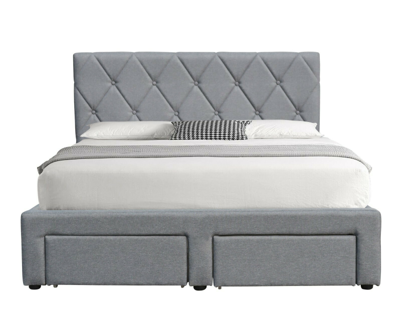 Łóżko BETINA z Szufladami – Elegancja i Funkcjonalność w Twojej SypialniWprowadź do swojej sypialni wyjątkowy styl i doskonałą organizację z łóżkiem BETINA. Ten elegancki i praktyczny mebel to idealne rozwiązanie dla tych, którzy cenią sobie zarówno estetykę, jak i maksymalne wykorzystanie przestrzeni. Połączenie klasycznego designu z inteligentnymi rozwiązaniami do przechowywania sprawi, że Twoja sypialnia stanie się prawdziwą oazą spokoju. Design i Materiały: Łóżko BETINA zostało obite wysokiej jakości tkaniną w uniwersalnym, popielatym kolorze, który doskonale komponuje się z różnorodnymi aranżacjami wnętrz. Wezgłowie łóżka jest prawdziwą ozdobą – charakteryzuje się efektownym pikowaniem w romby, nadającym mu wyrafinowanego i nowoczesnego wyglądu, jednocześnie zapewniając wygodne oparcie. Stabilna konstrukcja opiera się na solidnym drewnie litym, a czarne nóżki dodają kontrastu i podkreślają elegancki charakter mebla. Praktyczne Rozwiązania: Jedną z kluczowych zalet łóżka BETINA są cztery pojemne szuflady. Szuflady te są rozmieszczone praktycznie: po jednej z każdego boku łóżka oraz dwie od frontu, co zapewnia łatwy dostęp do przechowywanych przedmiotów z różnych stron. Wszystkie szuflady są osadzone na kółkach, co gwarantuje niezwykle płynne i łatwe wysuwanie oraz wsuwanie, nawet przy pełnym obciążeniu. To idealne rozwiązanie do przechowywania pościeli, koców, ubrań, książek czy innych drobiazgów, pomagając utrzymać porządek i maksymalnie wykorzystać przestrzeń w sypialni. Wymiary i Specyfikacja: