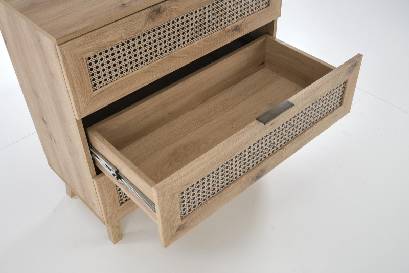 BORNEO KM-2 komoda dąb artisan/czarny Oferujemy komodę BORNEO KM-2, która wprowadzi do Twojego wnętrza niepowtarzalny styl i funkcjonalność. Wykonana z wysokiej jakości materiałów, takich jak płyta meblowa laminowana, MDF laminowany oraz płyta HDF laminowana, komoda łączy w sobie trwałość i estetykę, idealnie wpasowując się w różnorodne aranżacje wnętrz. Naturalny kolor dąb artisan podkreśla jej elegancję i sprawia, że doskonale komponuje się zarówno w nowoczesnych, jak i klasycznych przestrzeniach. Komoda BORNEO KM-2 oferuje przestronność i funkcjonalność dzięki swoim trzem szerokim szufladom, w których zorganizujesz swoją przestrzeń. Wymiary komody to 80 cm szerokości, 40 cm głębokości i 85 cm wysokości, co czyni ją idealnym meblem do sypialni, przedpokoju czy salonu. Świetnym uzupełnieniem są subtelne, wykończone w czarnym kolorze uchwyty oraz wyplecione fronty, które nadają meblu lekkości i nowoczesnego charakteru. Materiał: płyta meblowa laminowana, MDF laminowany, płyta HDF laminowana oraz polipropylen Kolor: dąb artisan (naturalny) z akcentami czarnymi Wymiary: 80 cm (szer.) x 40 cm (gł.) x 85 cm (wys.) Styl: nowoczesny, minimalistyczny Funkcjonalność: 3 szuflady z dużą pojemnością Wykończenie: nowoczesne uchwyty w kolorze czarnym i wyplecione fronty Kupując komodę BORNEO KM-2, otrzymujesz gwarancję producenta na 24 miesiące, co zapewnia bezpieczeństwo Twojego zakupu. Mebel jest dostarczany w paczce, co umożliwia samodzielny montaż. Szczegółowa instrukcja montażu znajduje się w przesyłce, dzięki czemu cały proces przebiegnie sprawnie i bezproblemowo. komoda, wymiary: 80/40/85 cm, materiał: płyta meblowa laminowana / MDF laminowany / płyta HDF laminowana / polipropylen, kolor: dąb artisan - naturalny