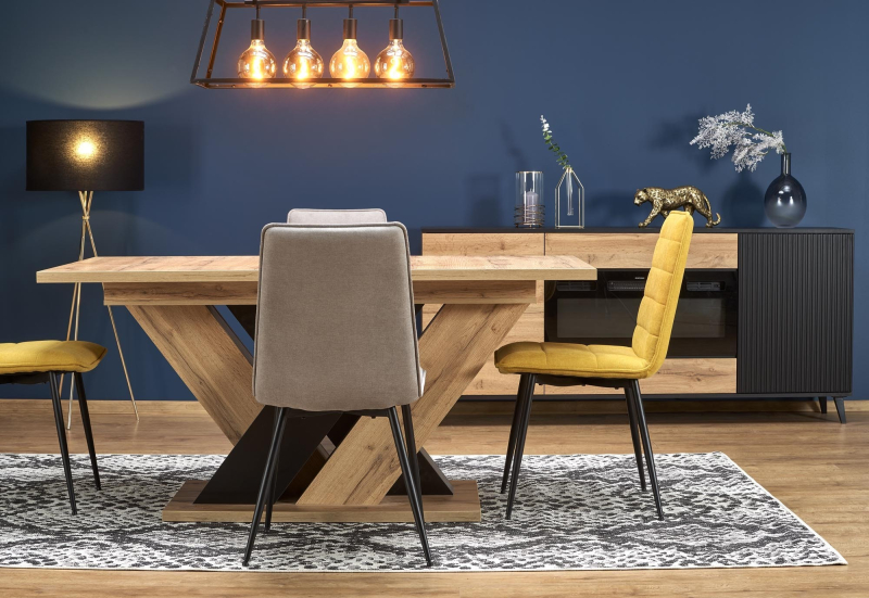 INFERNO stół rozkładany dąb naturalny - czarny Stół rozkładany INFERNO to idealne połączenie nowoczesnego designu z funkcjonalnością, które z pewnością wzbogaci Twoje wnętrze. Wykonany z wysokiej jakości materiałów, stół ten nie tylko prezentuje się stylowo, ale także zapewnia trwałość na lata. Jego naturalny dąb oraz stalowe nogi w odcieniu czarnym harmonijnie łączą się, tworząc elegancki element wyposażenia zarówno do jadalni, jak i salonu. Wymiary: rozkłada się od 100 cm do 300 cm długości, idealny do różnorodnych przestrzeni i okazji. Materiał: wytrzymały MDF pokryty okleiną naturalną dębową oraz solidne nogi wykonane ze stali malowanej proszkowo. Kolor: naturalny dąb na blacie oraz czarny na nogach, co nadaje mu nowoczesny i elegancki wygląd. Styl: minimalistyczny, który doskonale wpisze się w różne aranżacje wnętrz, od skandynawskich po industrialne. Stół INFERNO to nie tylko estetyka, ale także funkcjonalność, której potrzebujesz w codziennym użytkowaniu. Możliwość rozłożenia go pozwala na wygodne serwowanie większych posiłków i organizowanie spotkań rodzinnych czy towarzyskich. Jego designerskie wykończenie sprawia, że stanie się centralnym punktem każdej przestrzeni, zachwycając gości i domowników. Gwarancja producenta: 24 miesiące. Samodzielny montaż: stół dostarczany jest z instrukcją, co ułatwia jego szybkie i bezproblemowe złożenie. Dostawa: Oferujemy płatną usługę dostawy z wniesieniem. Prosimy o zaznaczenie tej opcji podczas składania zamówienia, aby cieszyć się komfortem bez dodatkowego wysiłku. Koszt usługi zostanie doliczony do zamówienia. stół rozkładany, wymiary: 100-300/100/76 cm, materiał: MDF + okleina naturalna (dębowa) / stal malowana proszkowo, kolor: blat - dąb naturalny, nogi - czarny