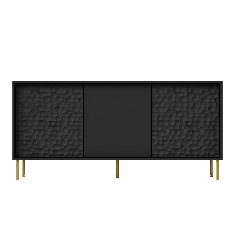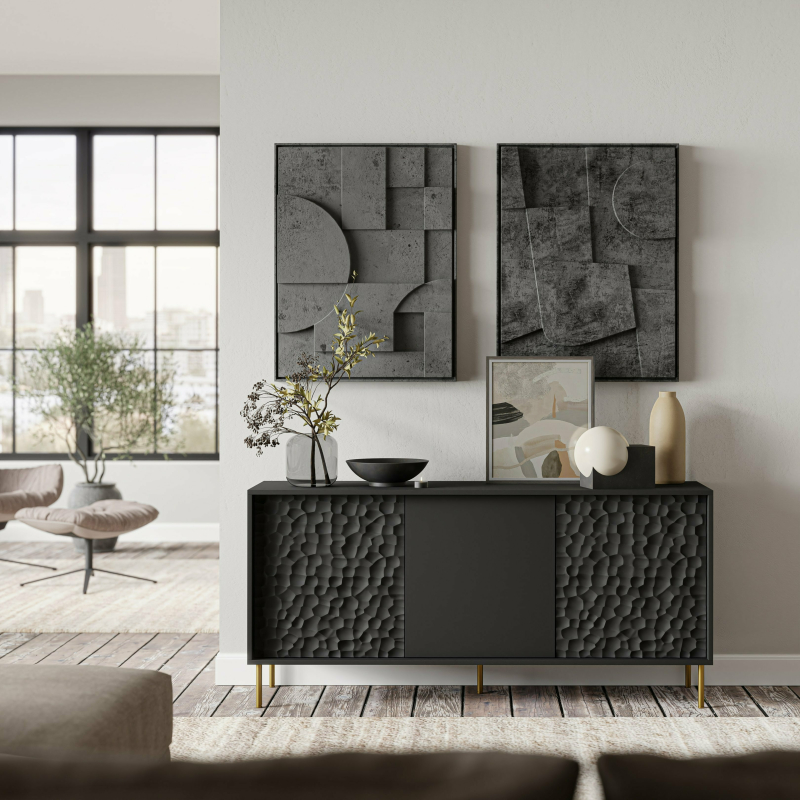 Odkryj Komodę BULLET KM-1 – kwintesencję nowoczesnej elegancji, która odmieni Twoje wnętrze!Wykonana z wysokiej jakości płyty meblowej laminowanej i MDF laminowanego w ponadczasowym czarnym kolorze, zachwyca subtelnym dekorem 3D na frontach, który dodaje jej unikalnego charakteru. Luksusowy akcent stanowią złote nóżki z polipropylenu, które nie tylko zapewniają stabilność, ale również wizualną lekkość i elegancję. Komoda BULLET KM-1 oferuje przestronne wnętrze z półkami, idealne do przechowywania różnorodnych przedmiotów, pomagając utrzymać porządek w Twoim salonie, jadalni czy sypialni. Jej uniwersalny design doskonale komponuje się z różnymi stylami wnętrzarskimi, od nowoczesnego po klasyczny. Informacje dodatkowe: