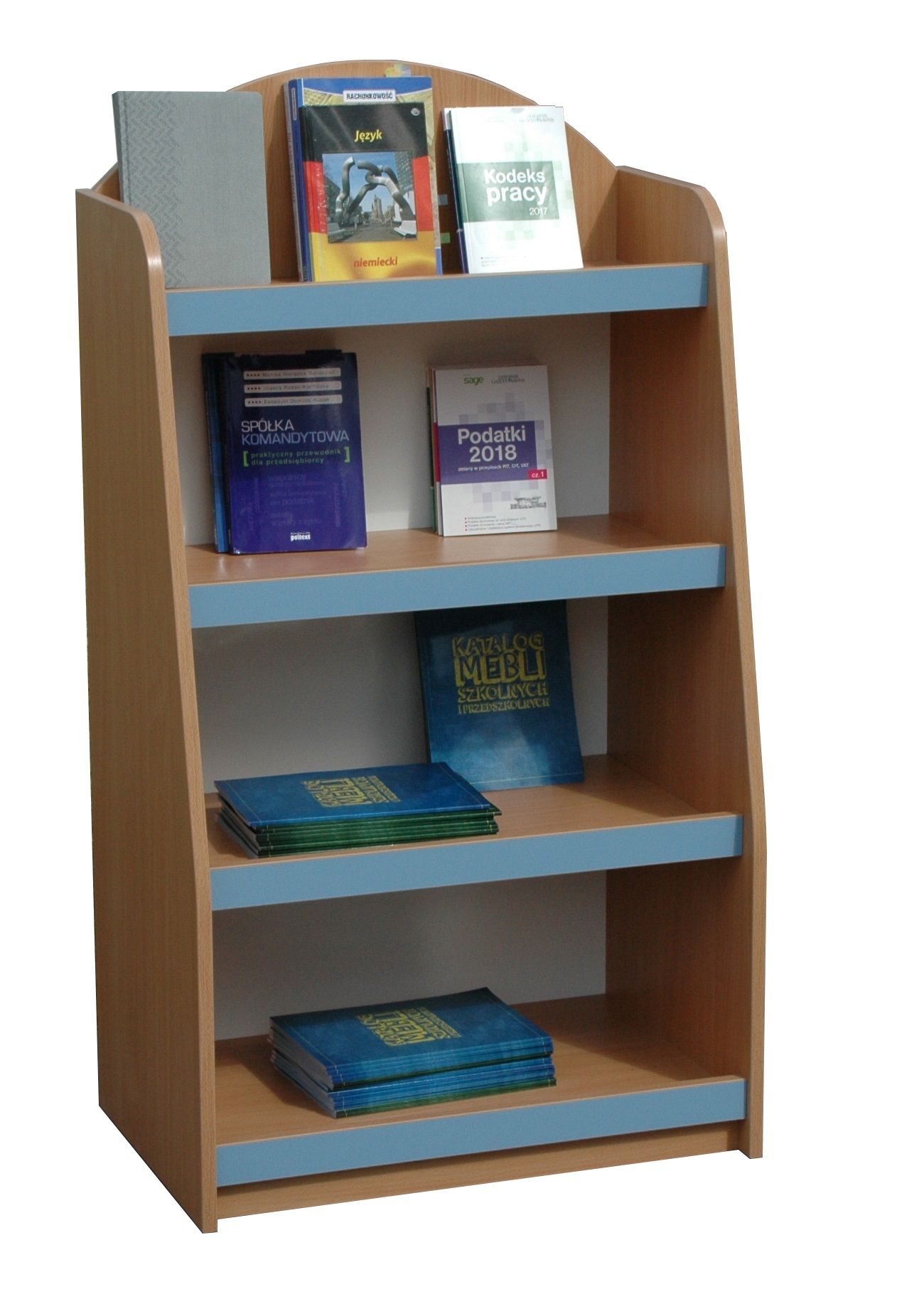 Dane techniczne | Regał posiada 4 półki do eksponowania książek. Wykonany jest z płyty laminowanej o gr. 18 mm, tył biała płyta HDF gr. 3,4 mm. Brzegi półek zabezpieczone kolorową listwą – kolor do wyboru wg naszego wzornika. Wymiary: wys. 1285, szer. 704, gł. na samym dole regału 450 mm. Kolorystyka płyty meblowej: Kolorystyka płyty meblowej do wyboru. |