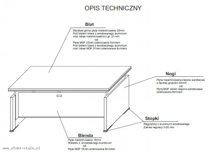 | NOGI: | Nogi z płyt melaminowanych, klejone warstwowo 43/ 25mm; Układ fladera (rysunku drewna) pod katem 90°; Regulatory z aluminium anodowanego, zakres regulacji 0-20mm; | |