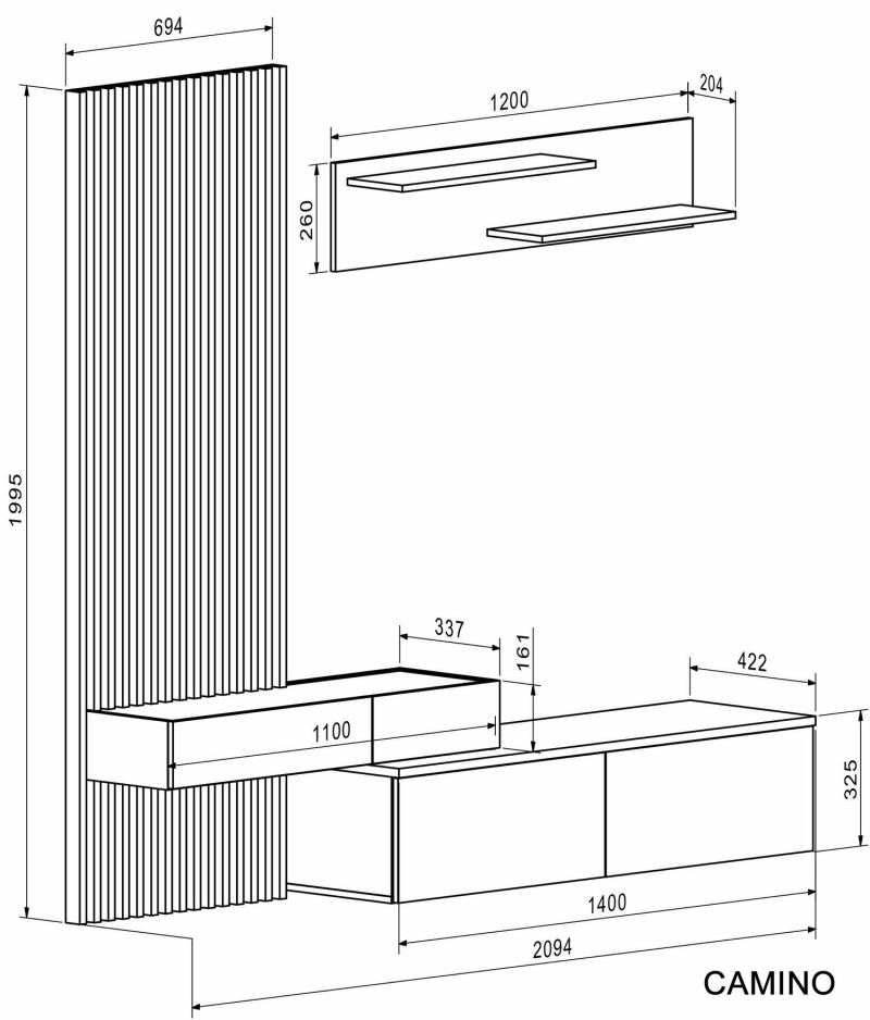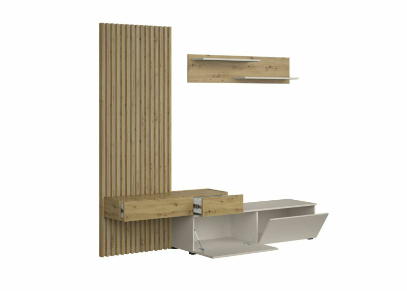 CAMINO ZESTAW MEBLI - DESIGN I INNOWACYJNOŚĆCAMINO to awangardowy zestaw mebli, który łączy nowoczesny design z zaawansowanymi rozwiązaniami technicznymi. Połączenie ciepłego dekoru dąb artisan z delikatnym kolorem kaszmir nadaje wnętrzu harmonijny i elegancki charakter, jednocześnie zapewniając mnóstwo praktycznej przestrzeni do przechowywania. Kluczowym elementem zestawu jest efektowny, pionowy panel z lamelami, który stanowi idealne tło dla minimalistycznej szafki RTV. Elementy wchodzące w skład zestawu:Zestaw CAMINO charakteryzuje się asymetryczną, intrygującą kompozycją, w skład której wchodzą: